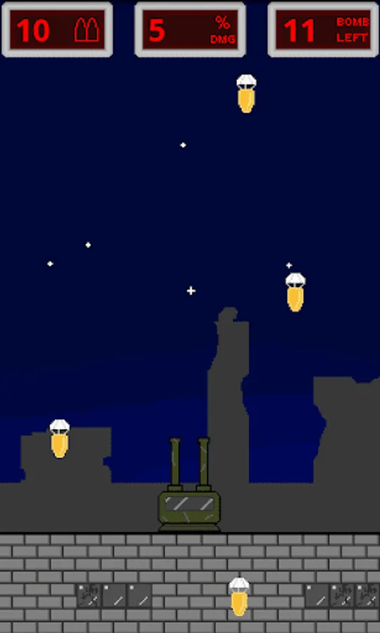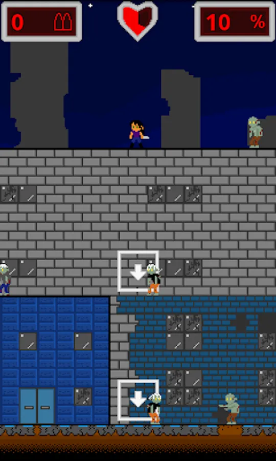 Each stage is divided into two phases, which play like two different games. In the first phase, you must fend off zombies armed with only a knife, collecting any cannon shells they drop along the way. In the second phase, you must use the ammo collected from the zombies to shoot down bombs and aircraft with an anti-aircraft turret to prevent the city from being leveled.