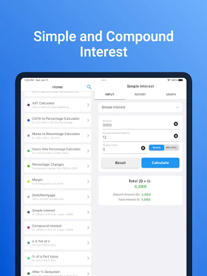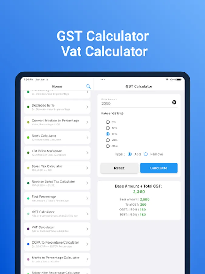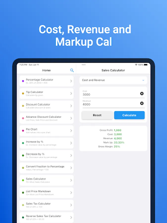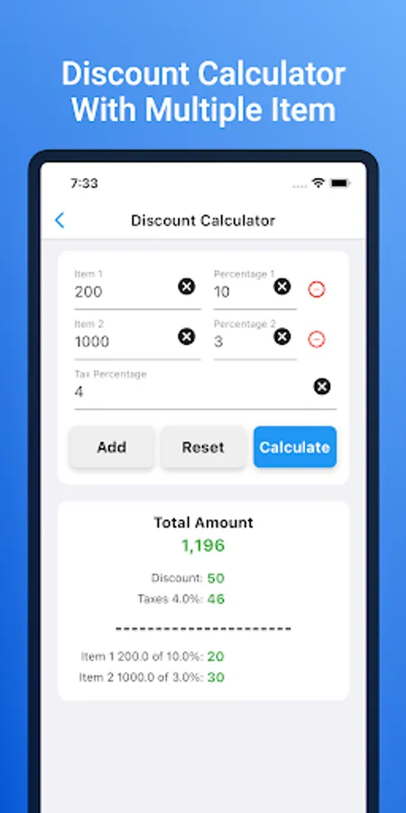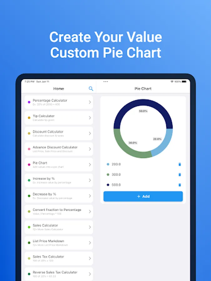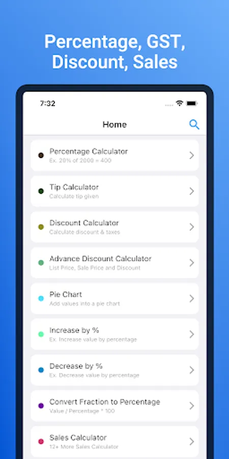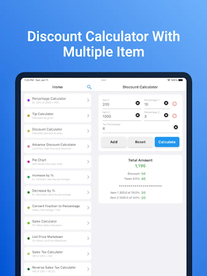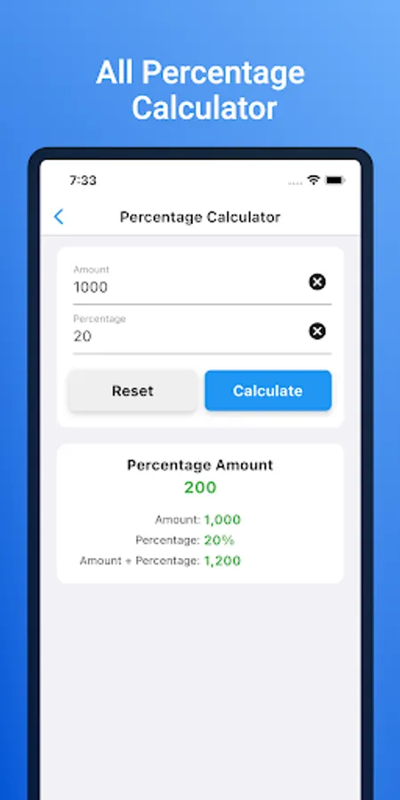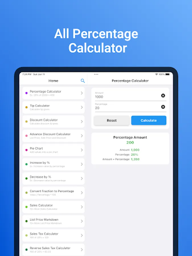 Introducing the version of Percentage Calculator, the ultimate tool for everyday calculations! Whether you're out shopping or managing your finances, this app is your go-to solution for quickly and accurately Percentage, Tip, Discount, Advanced Discount, Pie Chart, Increase %, Decrease %, Fraction to Percentage, Sales, List Price, Sales Tax, Reverse Tax, Find Percentage, GST, VAT, CGPA to Percentage, Marks to Percentage, Salary Hike, Percentage Changes, Margin, Debt/Mortgage, Simple Interest, Compound Interest, a % of b in c, % of Part Value, After Deduction, After Addition.