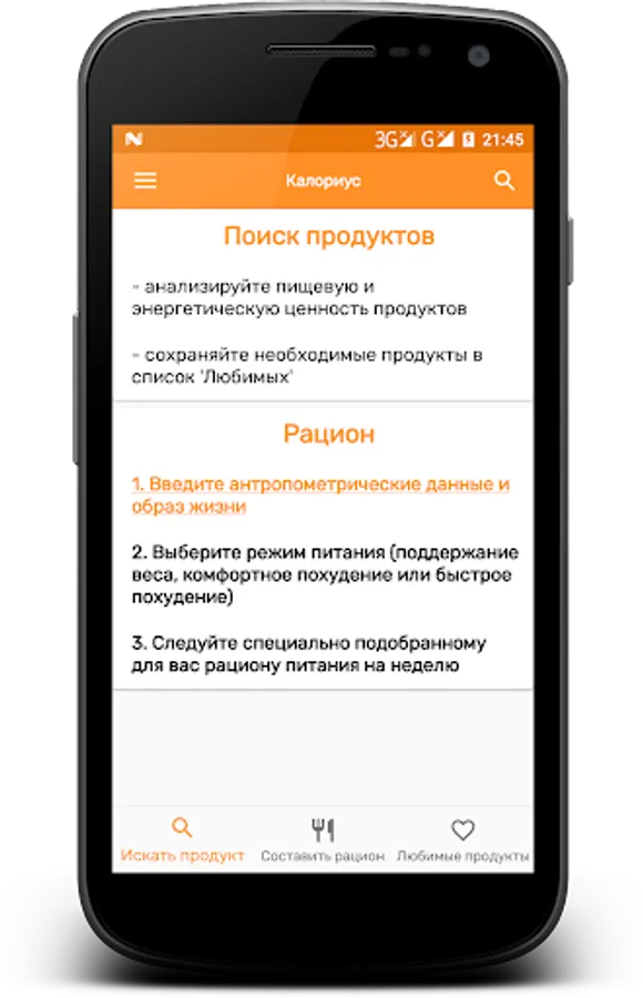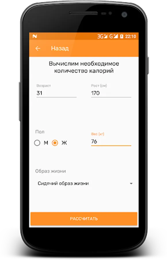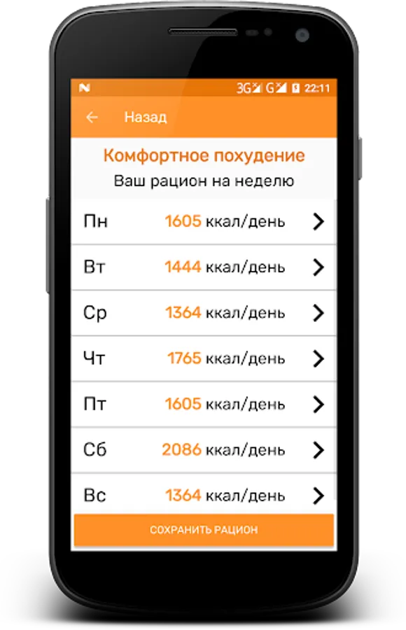- automatic calculation of the necessary number of calories per day for the selected type of diet