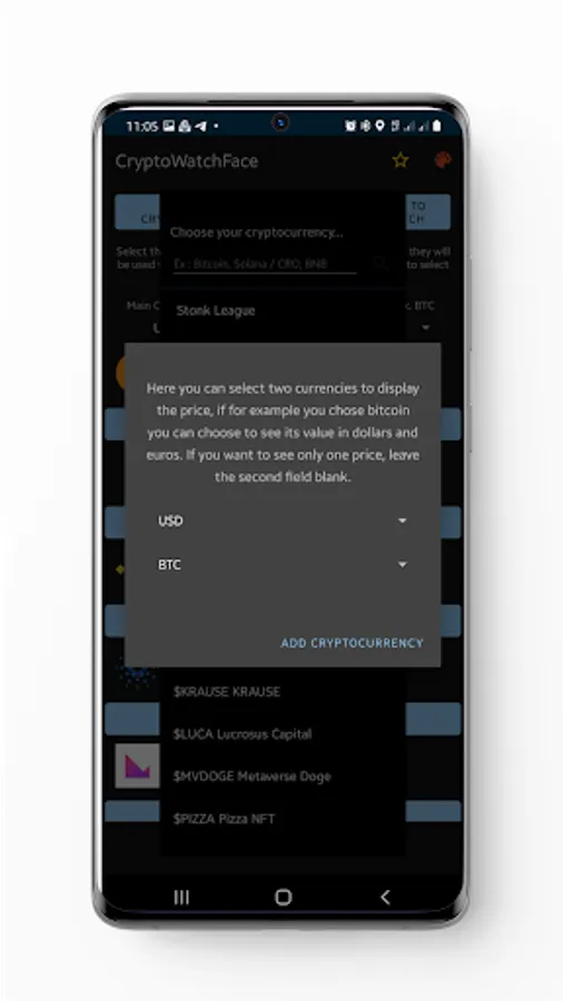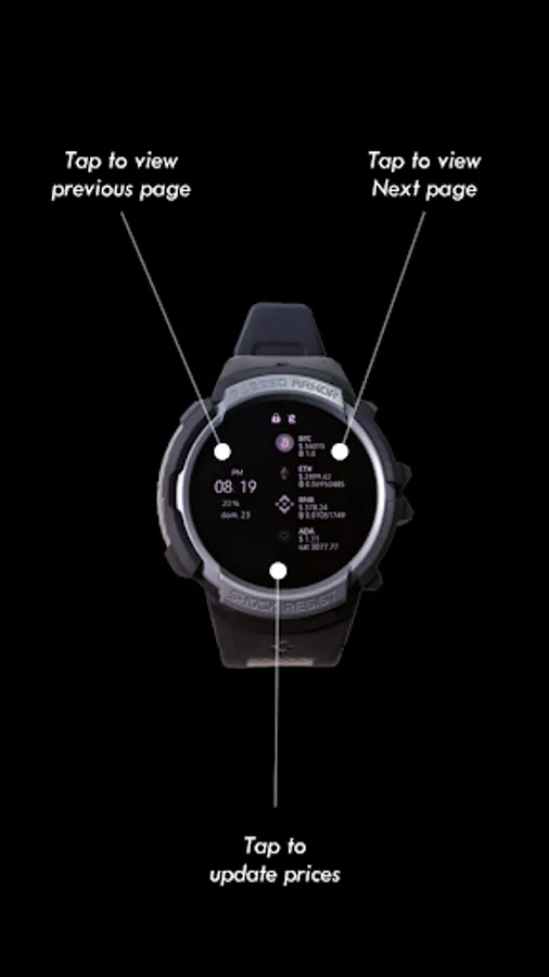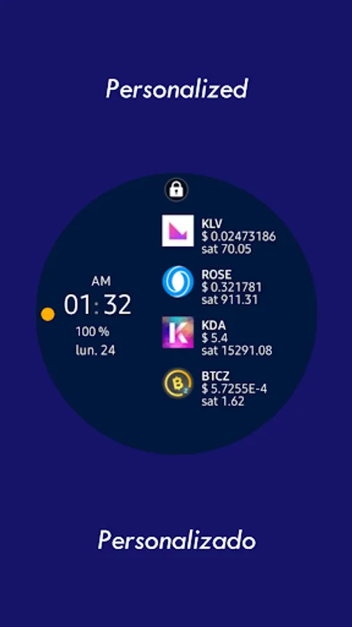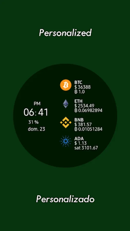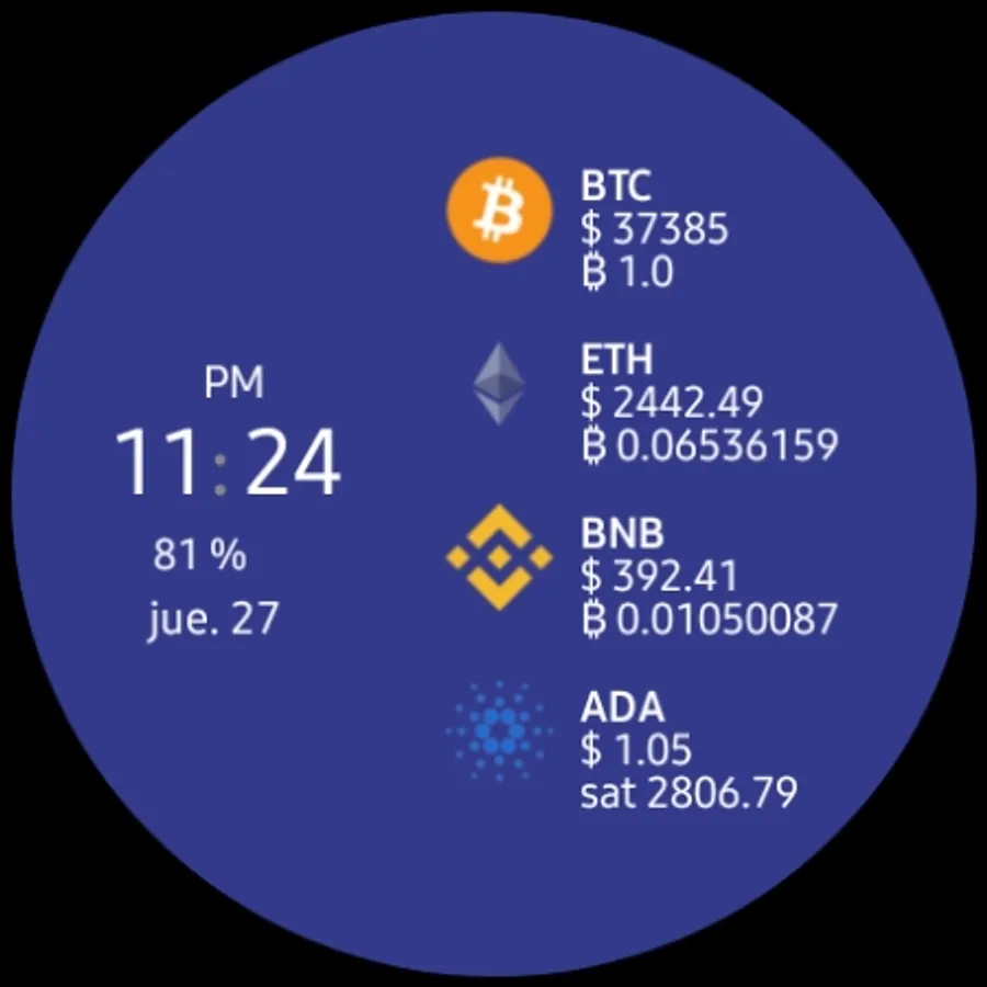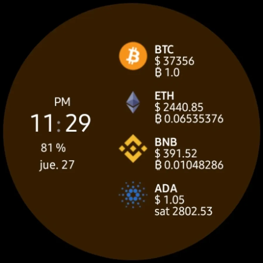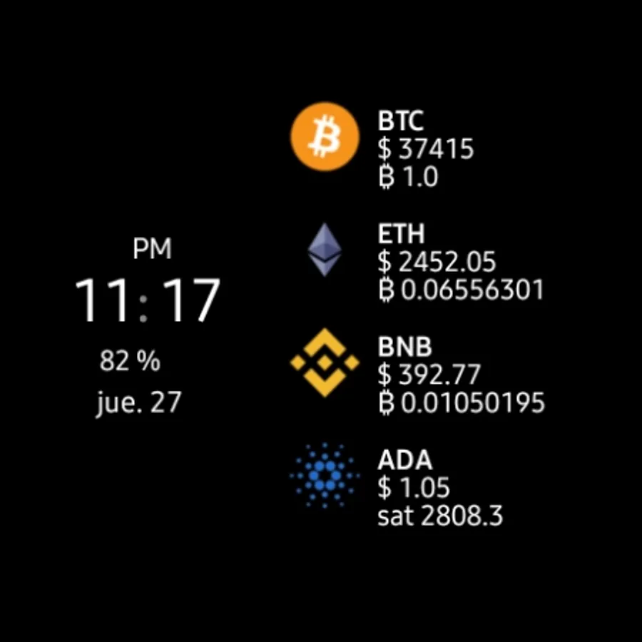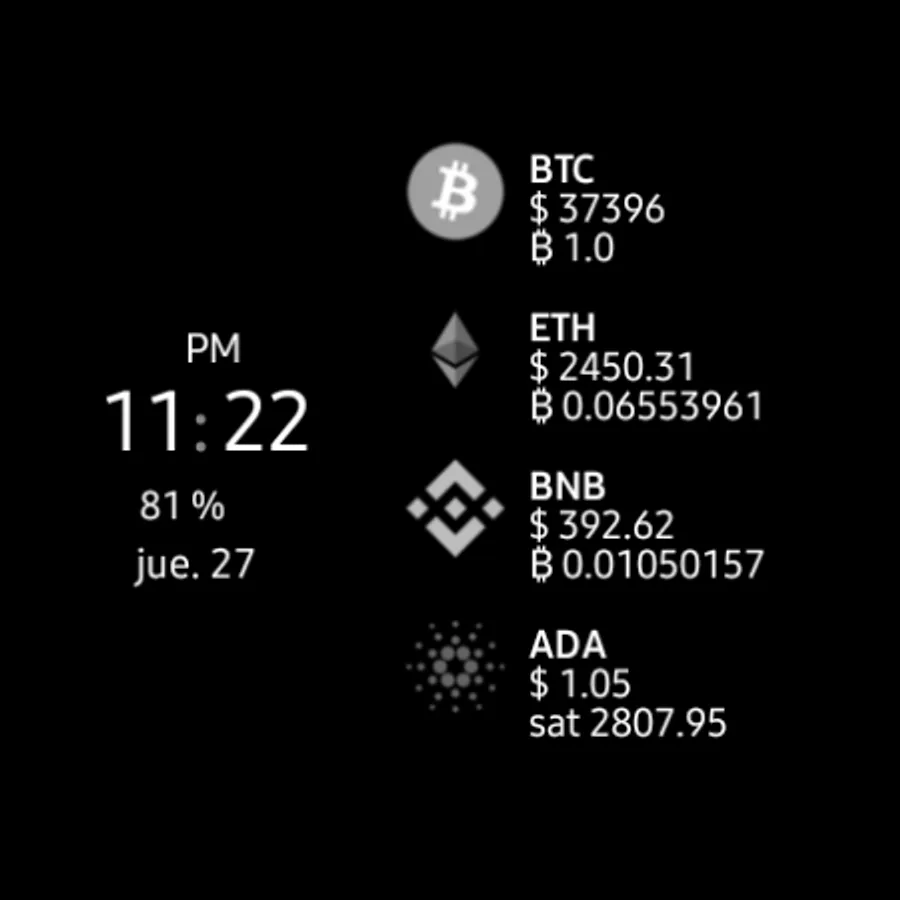 This watch face is designed to track the prices of your favorite cryptocurrencies thanks to the Coingecko api, initially you will see 4 of the main coins based on their capitalization BTC, ETH, BNB, ADA, these come by default so you can familiarize yourself With the interface, these are seen in prices vs US dollar, BTC and Sat equivalent to bitcoin satoshis, for coins with lower values such as ADA.