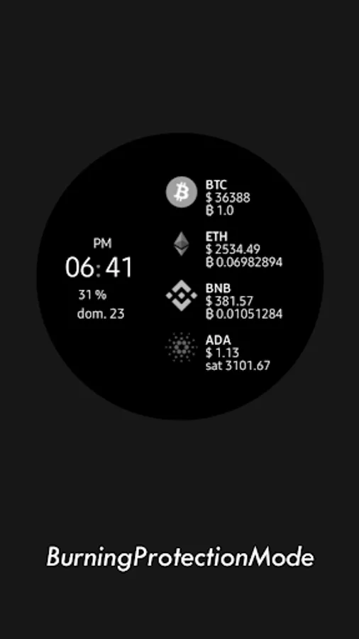 This clock face has anti burning support, when you keep the screen always on the icons of your coins will be black and white, enjoy it, I will be attentive to the initial news until we stabilize this tool for everyone.