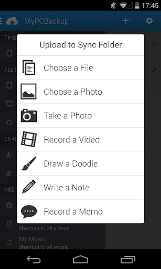 In addition to all these great features, you can also record a voice memo, draw a doodle, take notes, or add a photo to your SyncFolder. You can instantly upload any of your files to MyPC Backup or publish them to Facebook or Twitter.