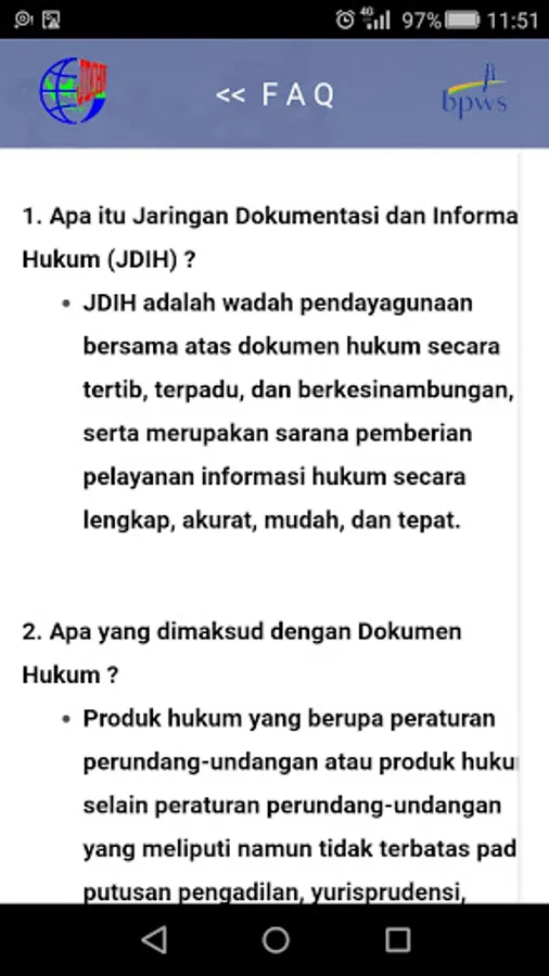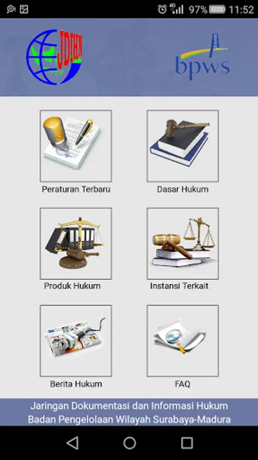 The Legal Documentation and Information Network (JDIH) of the Surabaya-Madura Regional Development Agency (BPWS) of the Republic of Indonesia is a joint use of BPWS legal documents and is a means of providing legal information services easily, quickly and accurately.
