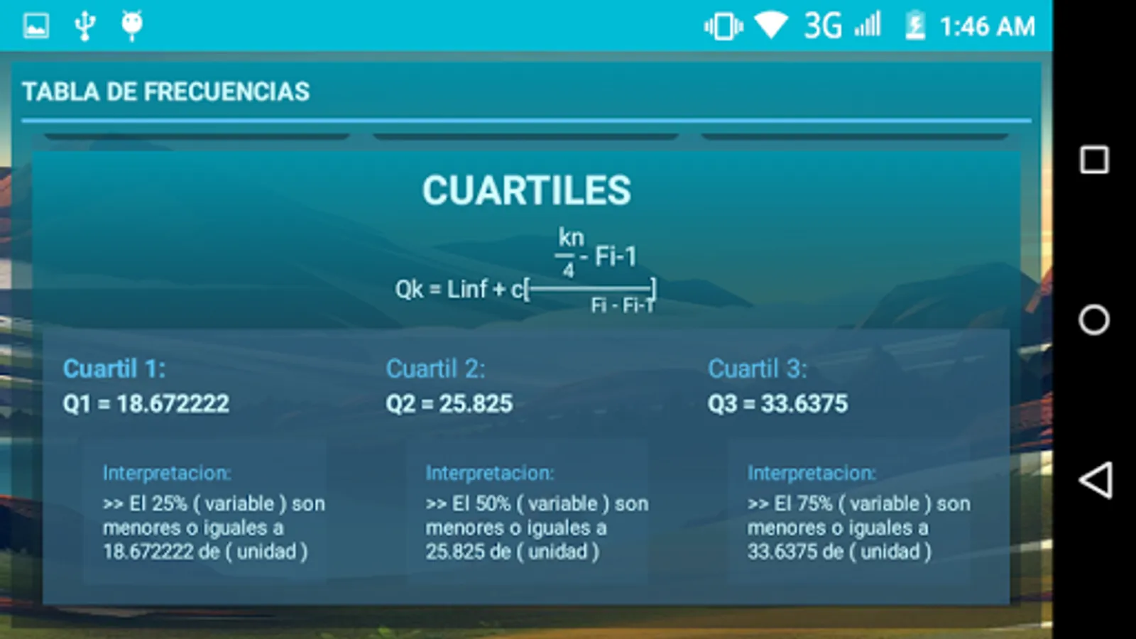 And calculator to work with grouped data and dispersed data, to calculate the mean, median, mode, percentiles, quartiles, deciles, variance, standard deviation, coefficient of variation, all accurate calculations and each with the appropriate formula.