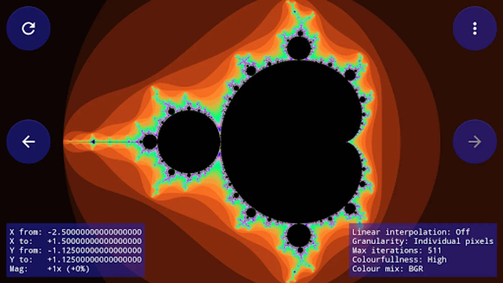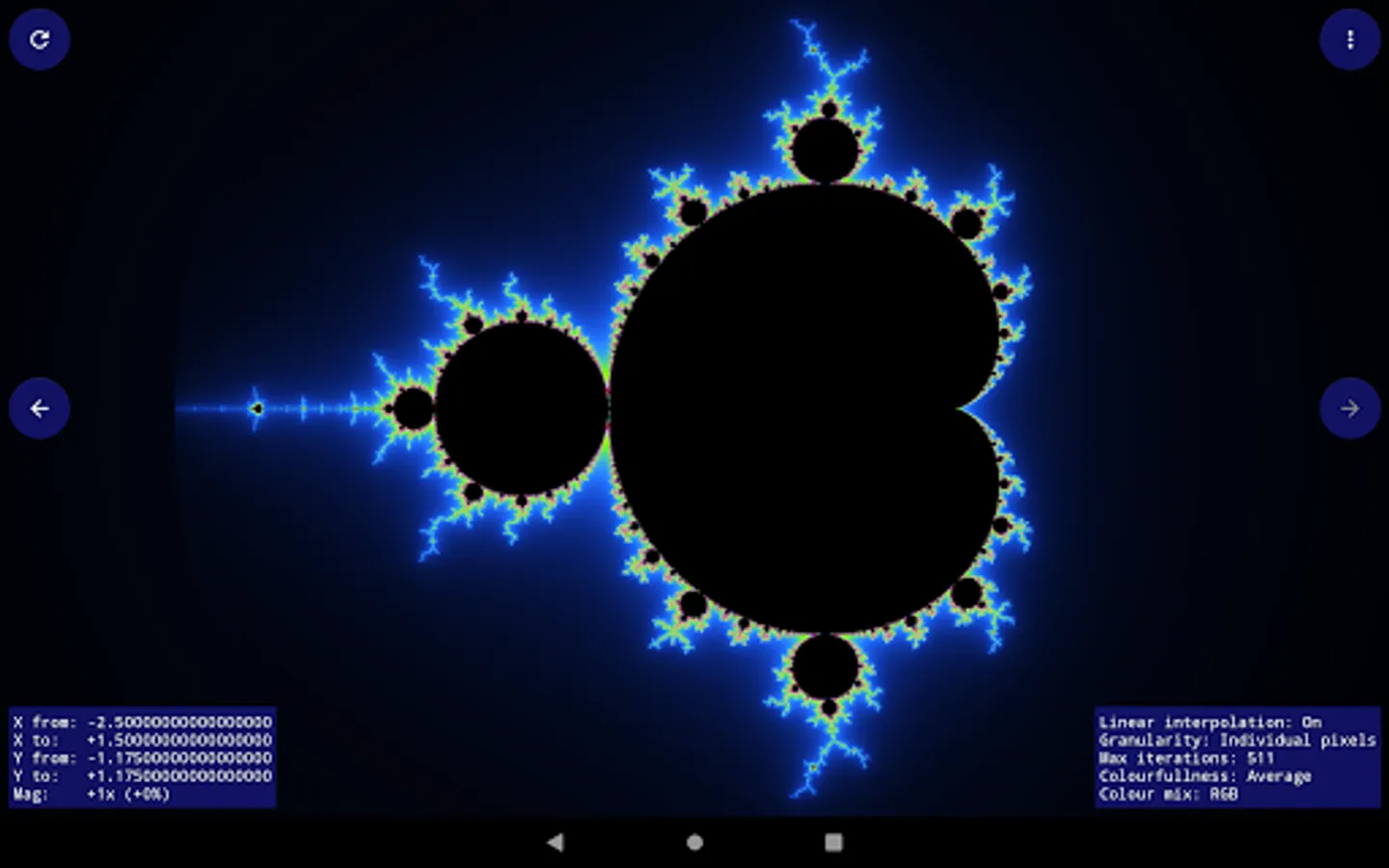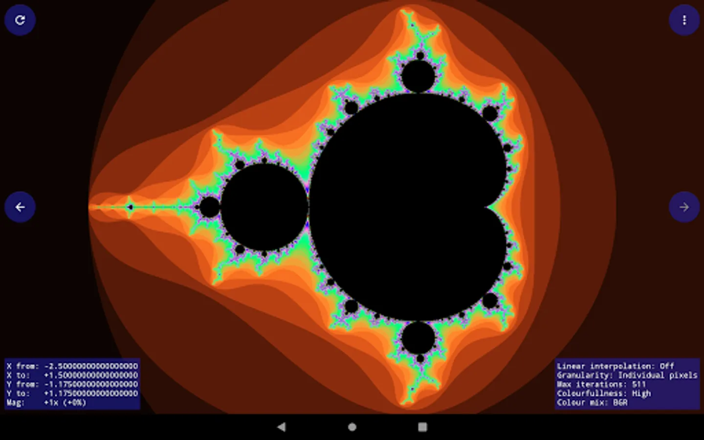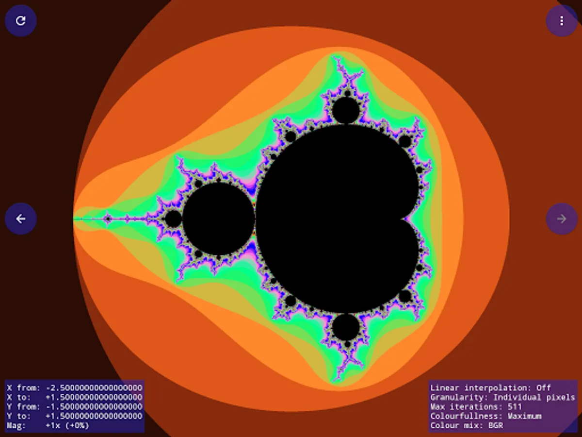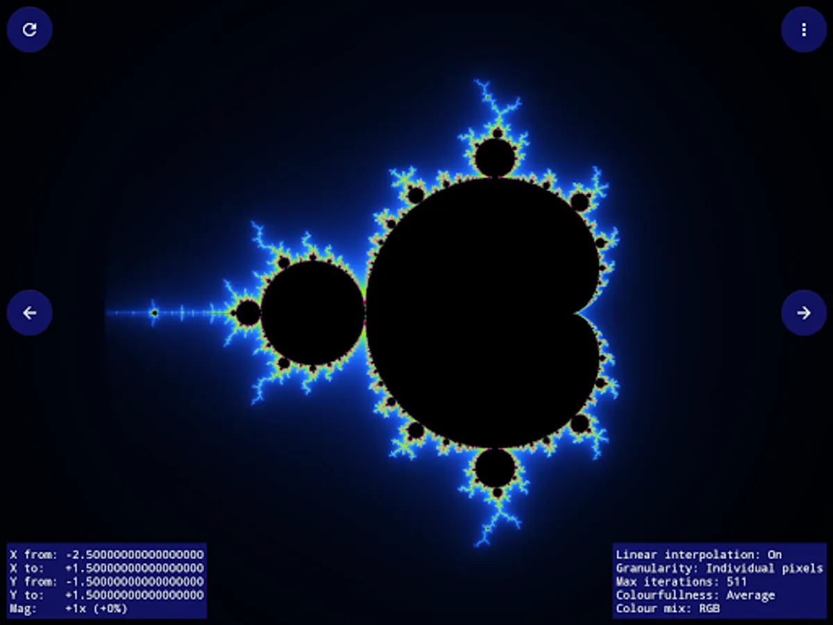 Swipe, pinch and zoom around the Mandelbrot Set - or manually enter Set coordinates to be displayed. Tap to redraw or set ‘auto redraw’ on.