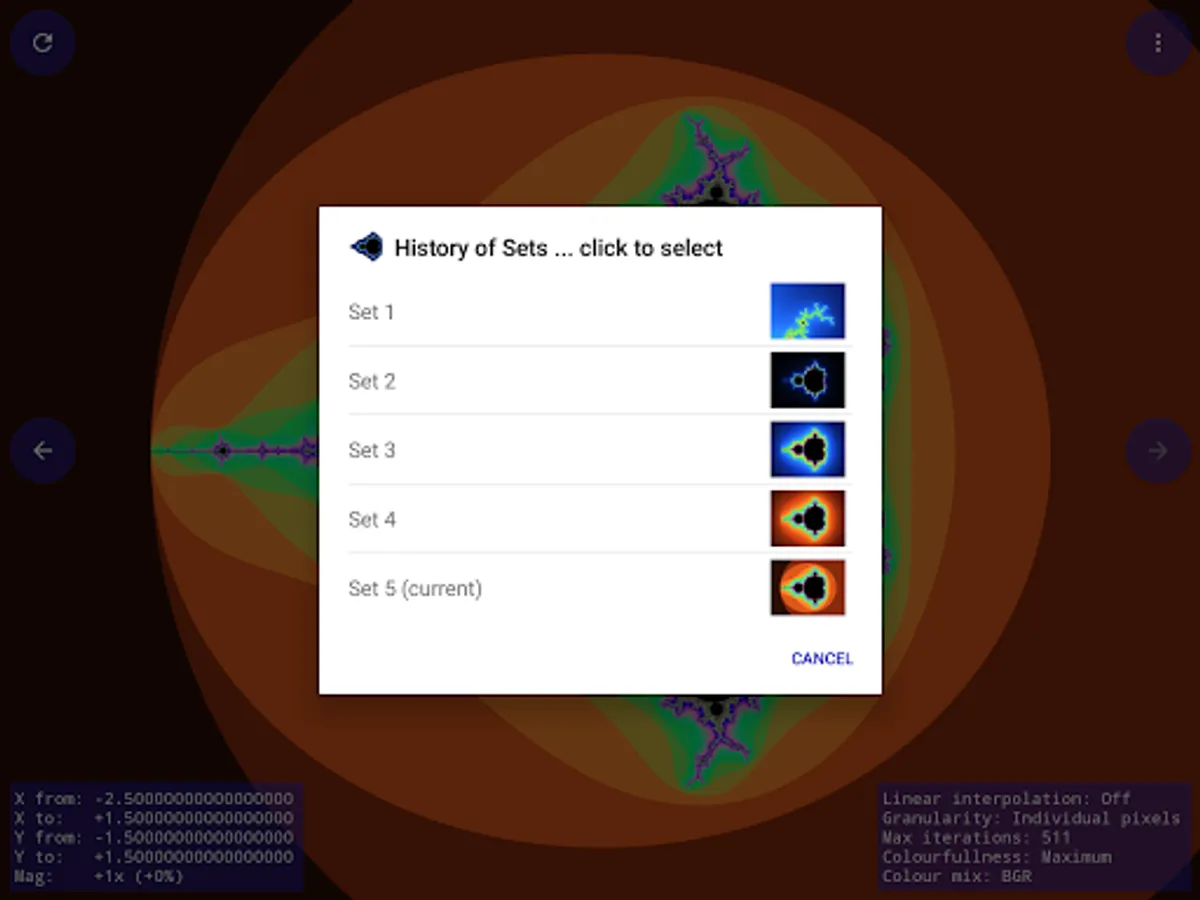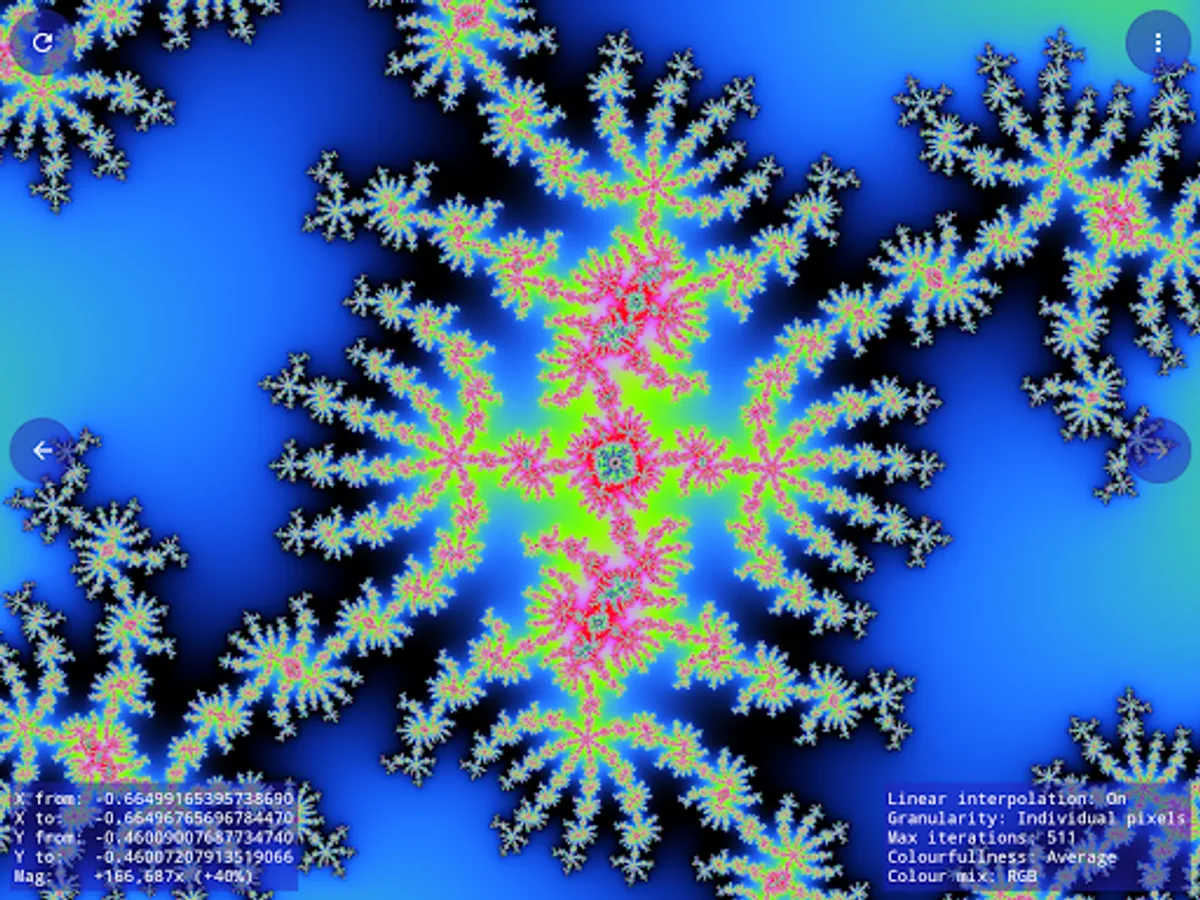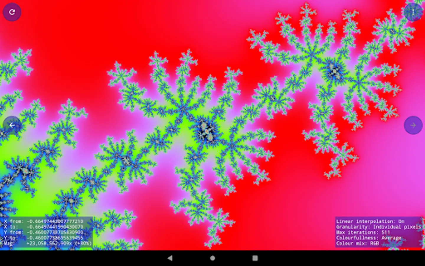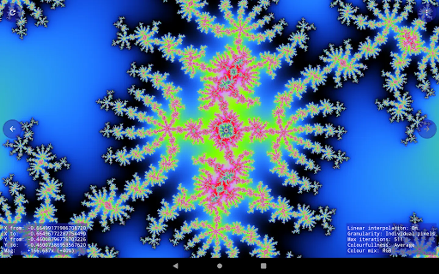 Swipe, pinch and zoom around the Mandelbrot Set - or manually enter Set coordinates to be displayed. Tap to redraw or set ‘auto redraw’ on.