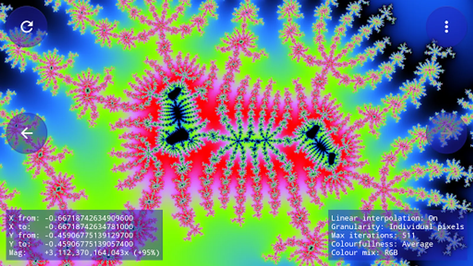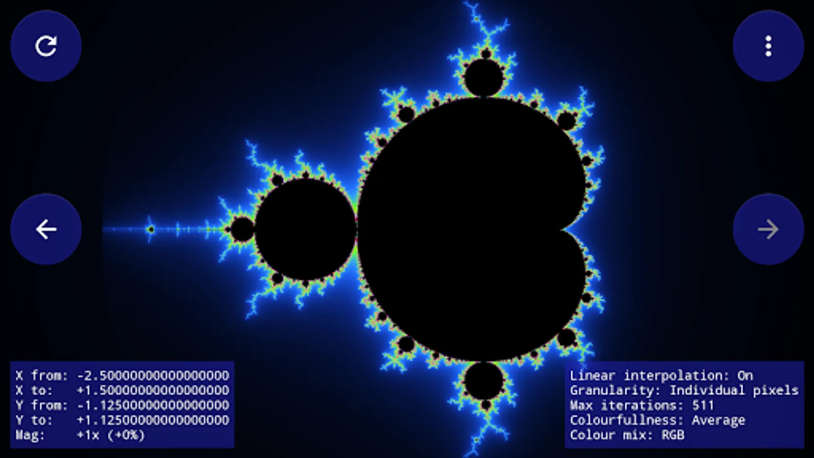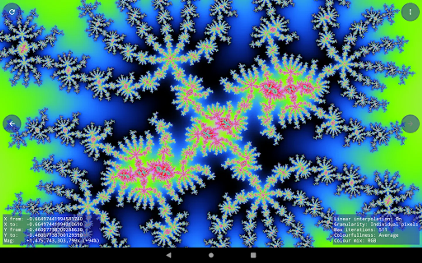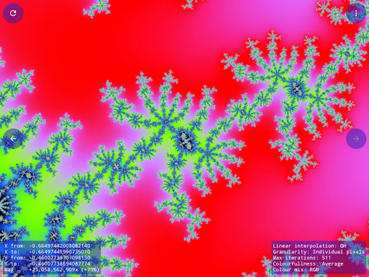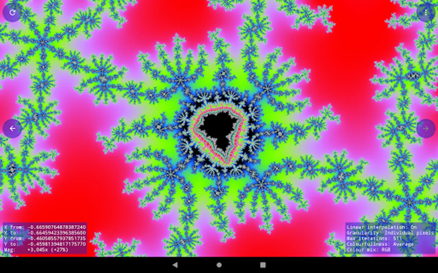 Swipe, pinch and zoom around the Mandelbrot Set - or manually enter Set coordinates to be displayed. Tap to redraw or set ‘auto redraw’ on.