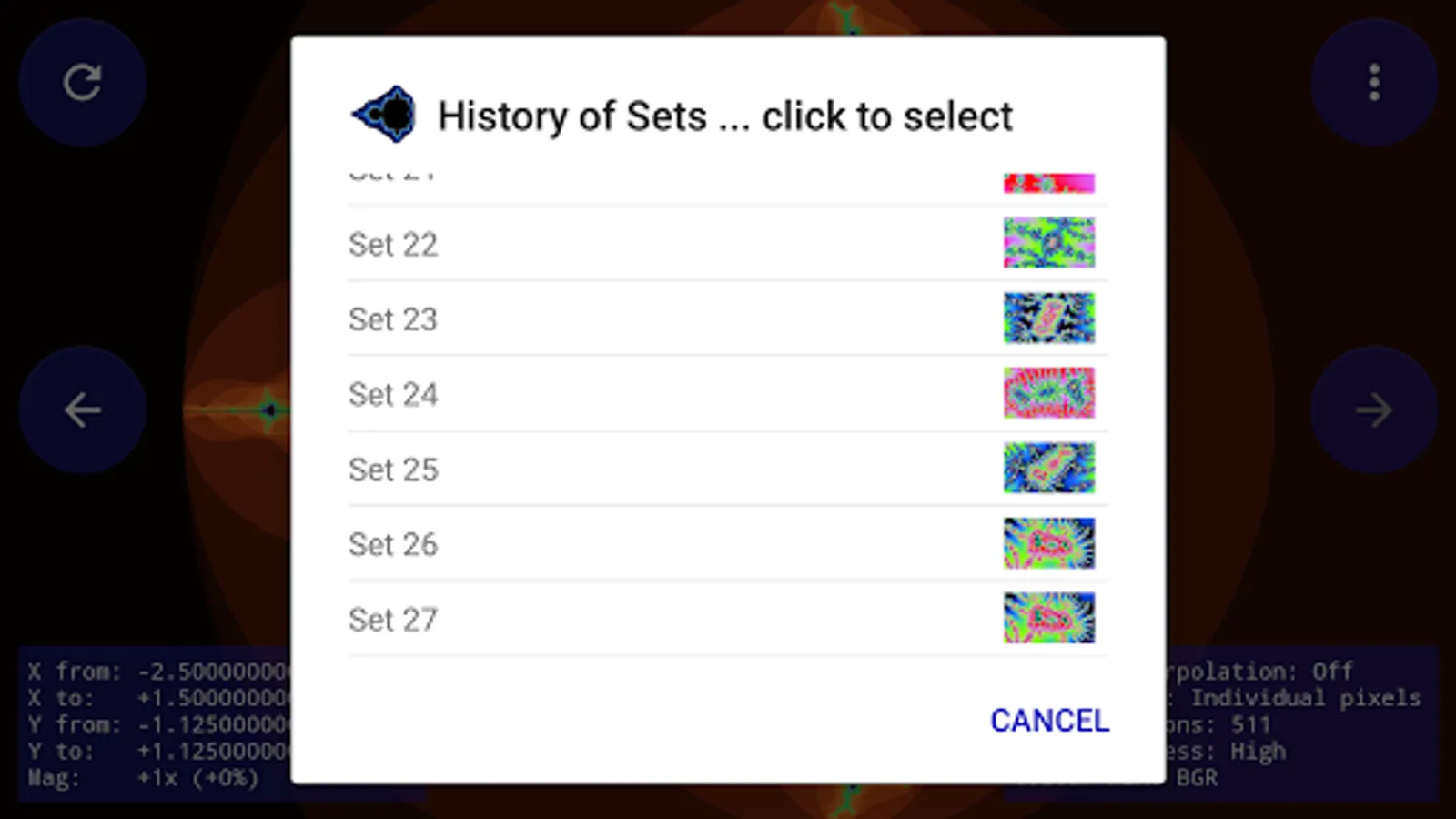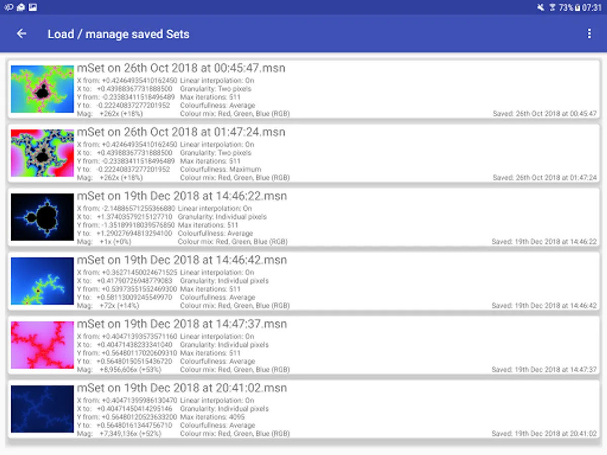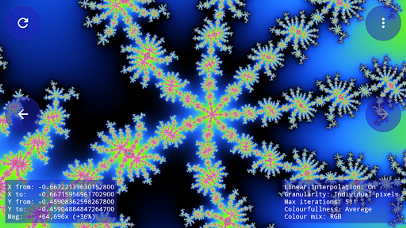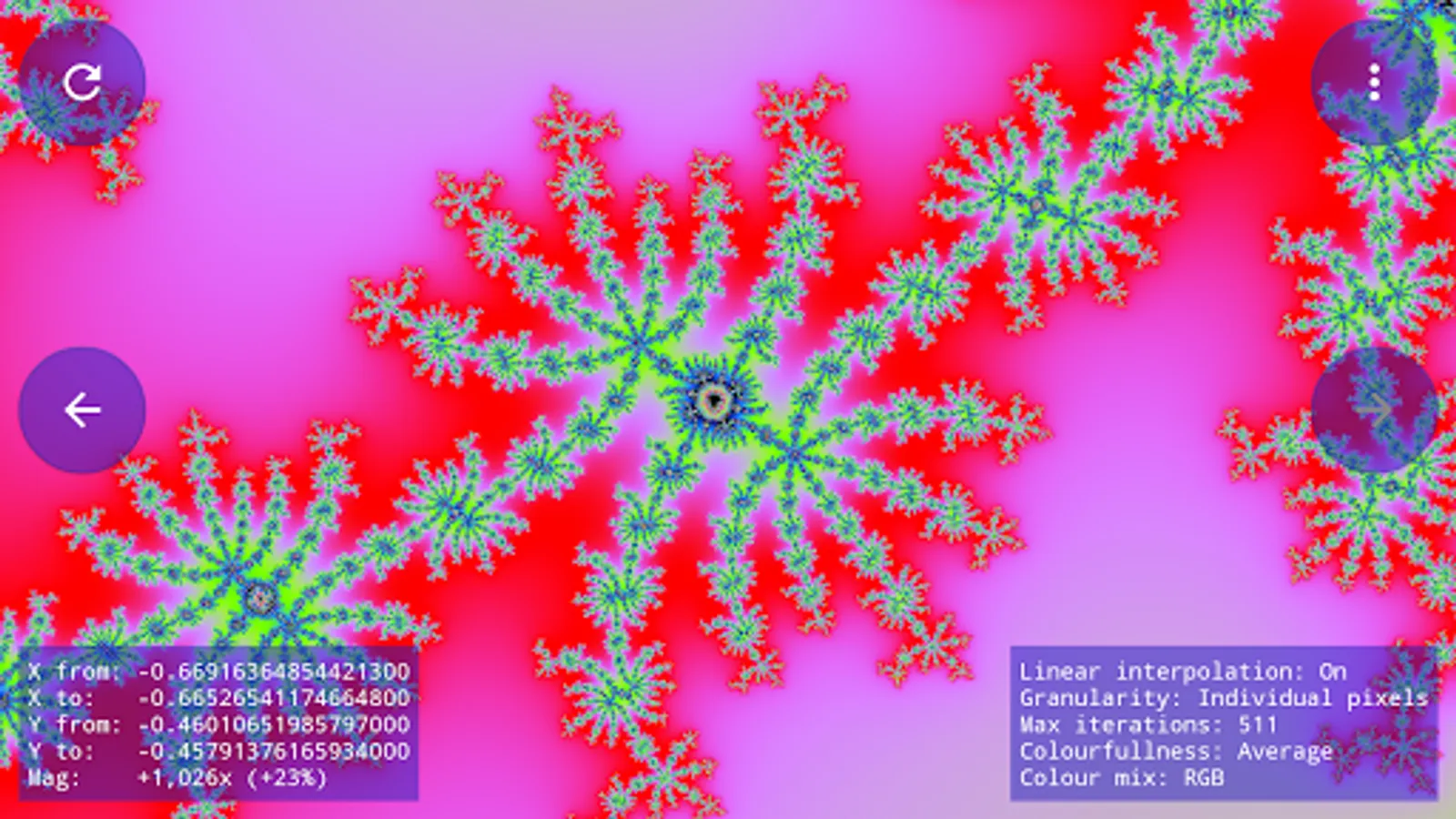 Swipe, pinch and zoom around the Mandelbrot Set - or manually enter Set coordinates to be displayed. Tap to redraw or set ‘auto redraw’ on.