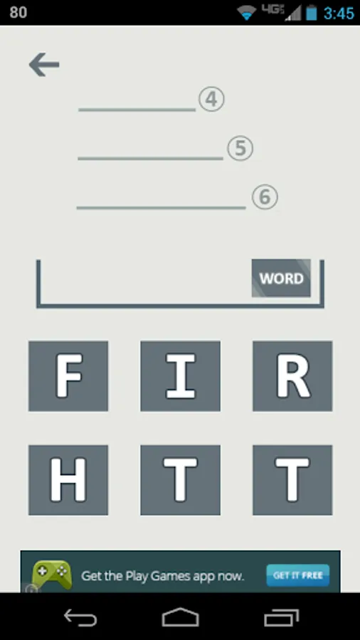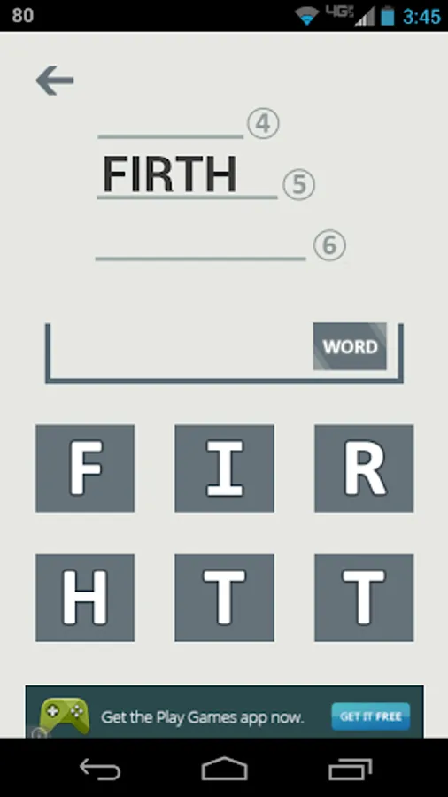 Using the given six letters, form a four letter word, a five letter word, and a six letter word to move onto the next puzzle.