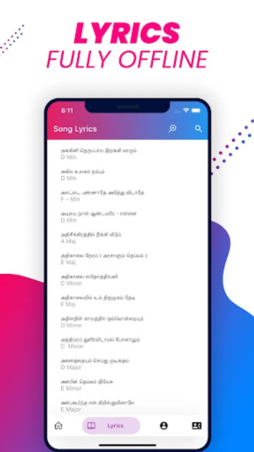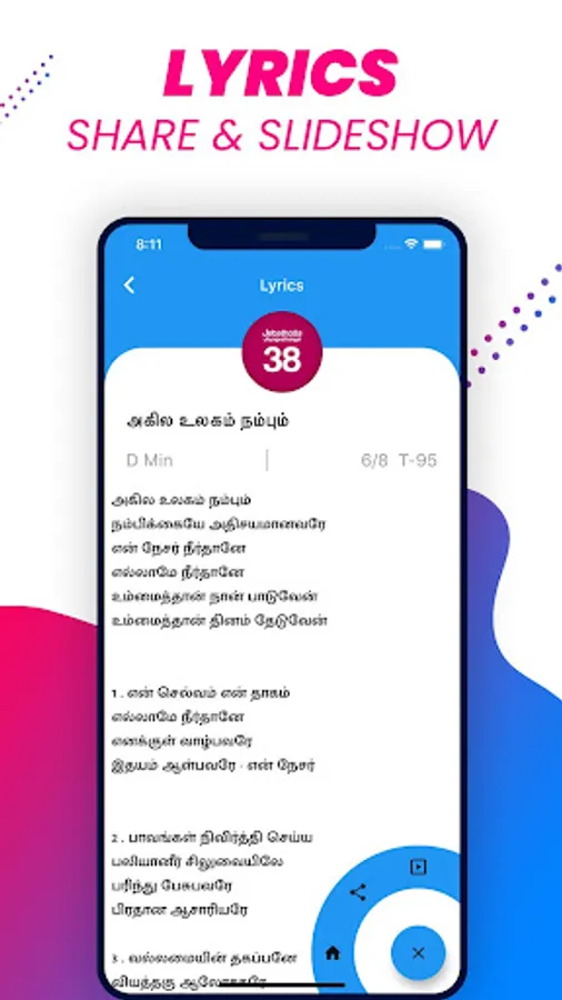 * Lyrics: Fully offline, Slide show, Easy-share, Any word search, Title search