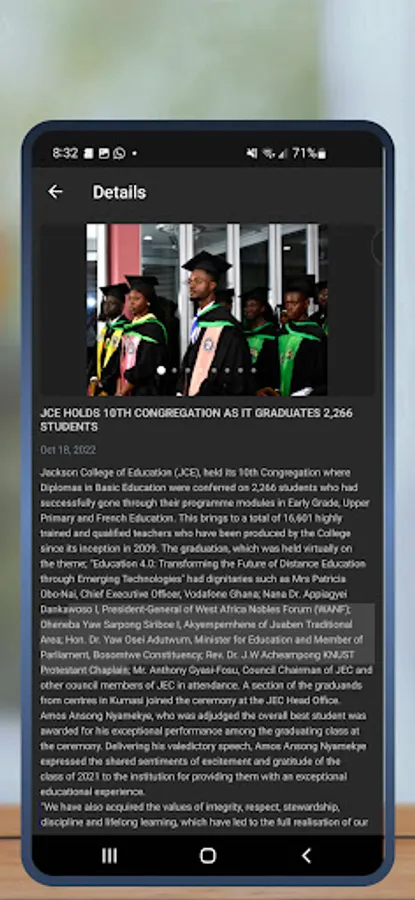 JEC was established in 2009. It currently runs the Jackson College of Education, which offers the following programmes: a 4-year Bachelor of Education programme and a 2-year Top-Up to Bachelor of Education (Post Diploma) programme. JEC is accredited by the National Accreditation Board and affiliated with the University of Education, Winneba.