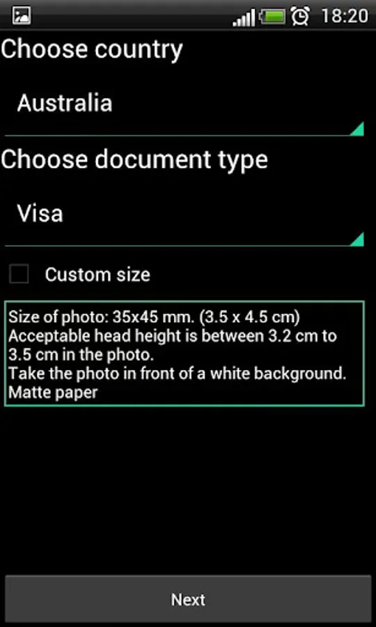 ID Photo App is a simple, easy application for Android mobile for making photos instantly for any type of documents (passport, driver's license, etc.). ID Photo App supports predefined photo layouts for various types of documents as it’s requirements. ID Photo App knows the requirements of many types of documents of different countries. It can use a new photo instantly taken by camera or photo from your gallery. After processing, ID Photo generates a printable graphical file for your document. Additionally ID Photo offers touch to crop and adjust color (gray-scale) for your photos.