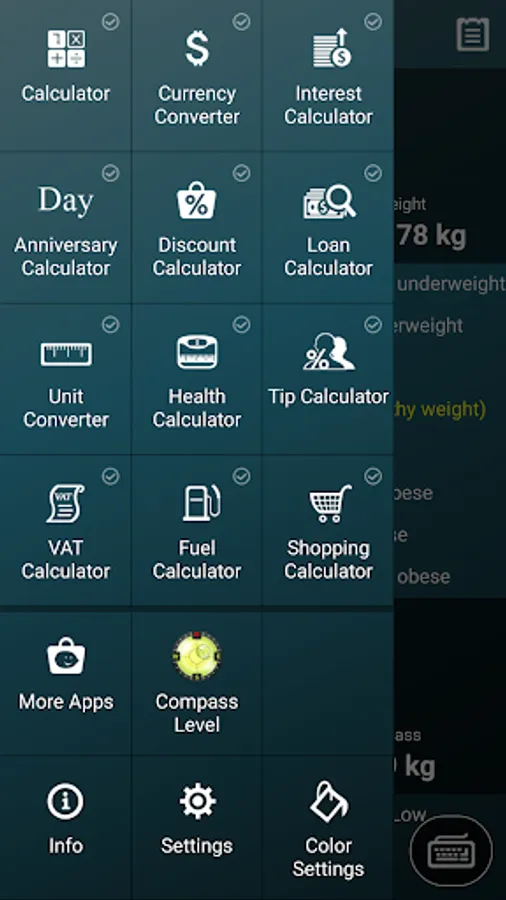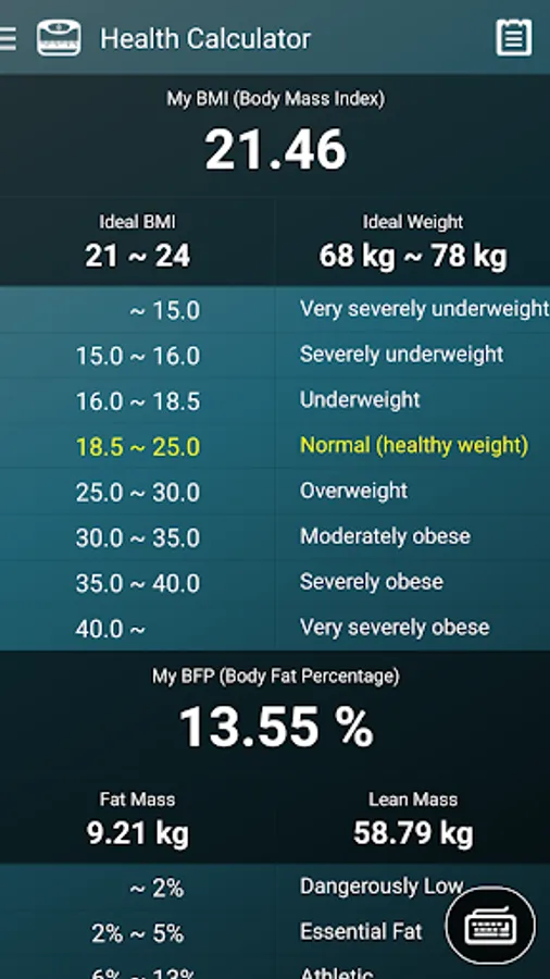 - Calculate BMI(Body Mass Index), BFP(Body Fat Percentage) and Ideal Weight in one screen