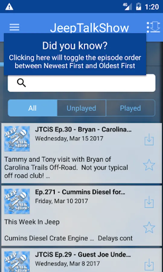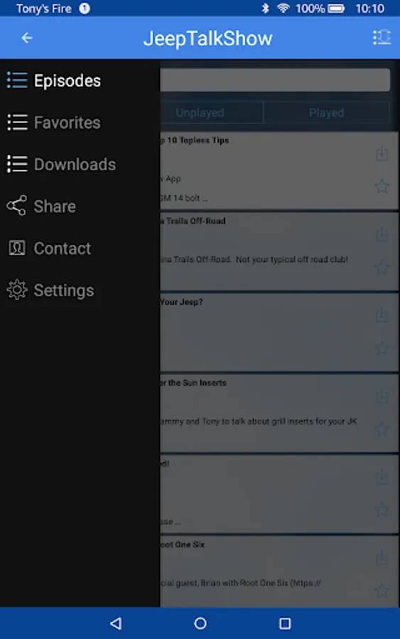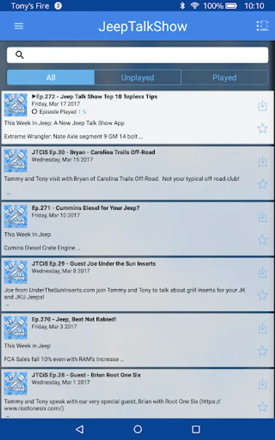 This is the most convenient way to access Jeep Talk Show on your phone. With this app you are always connected to the latest episodes and the show. You can also star your favorite episodes and save them to a list so you can easily enjoy them over and over! This app is complete access to Jeep Talk Show and if you're a fan of the show you won't want to be without it!