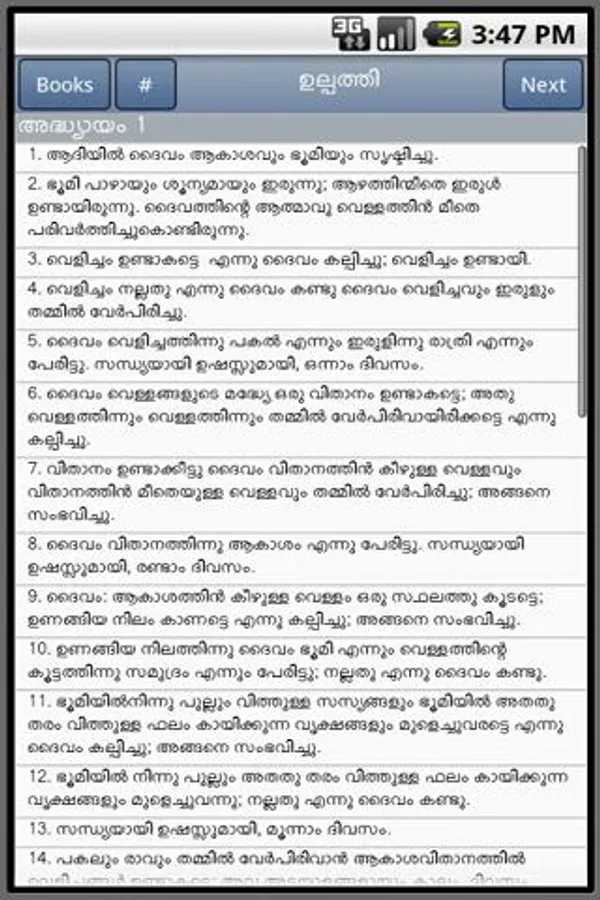 Malayalam content for this App is obtained from "The Complete Malayalam Bible In Unicode Ver 2.4" encoded by Nishad Kaippally. It may have minor errors. Any help in proof checking will be greatly appreciated. I will push updates to the content as a new version as it is available.