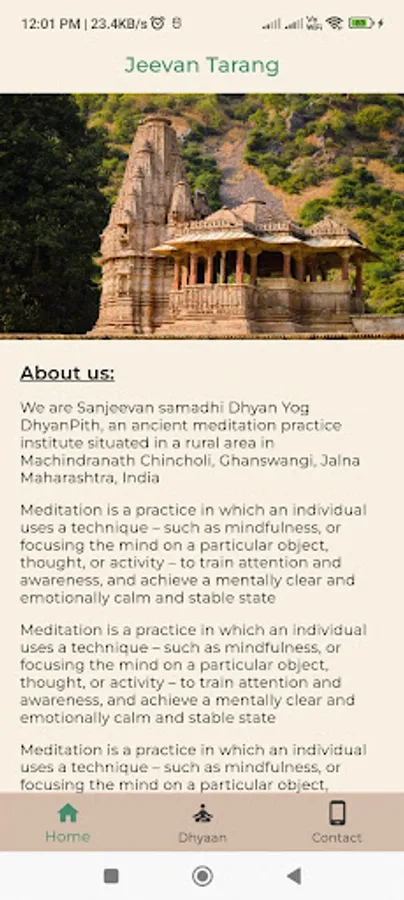 We are Sanjeevan samadhi Dhyan Yog DhyanPith, an ancient meditation practice institute situated in a rural area in Machindranath Chincholi, Ghanswangi, Jalna Maharashtra, India