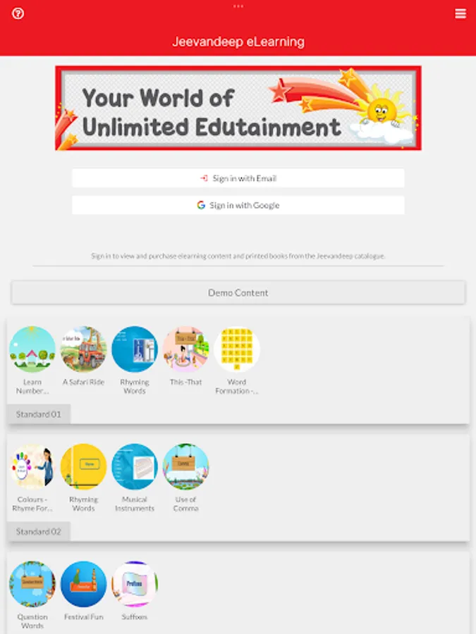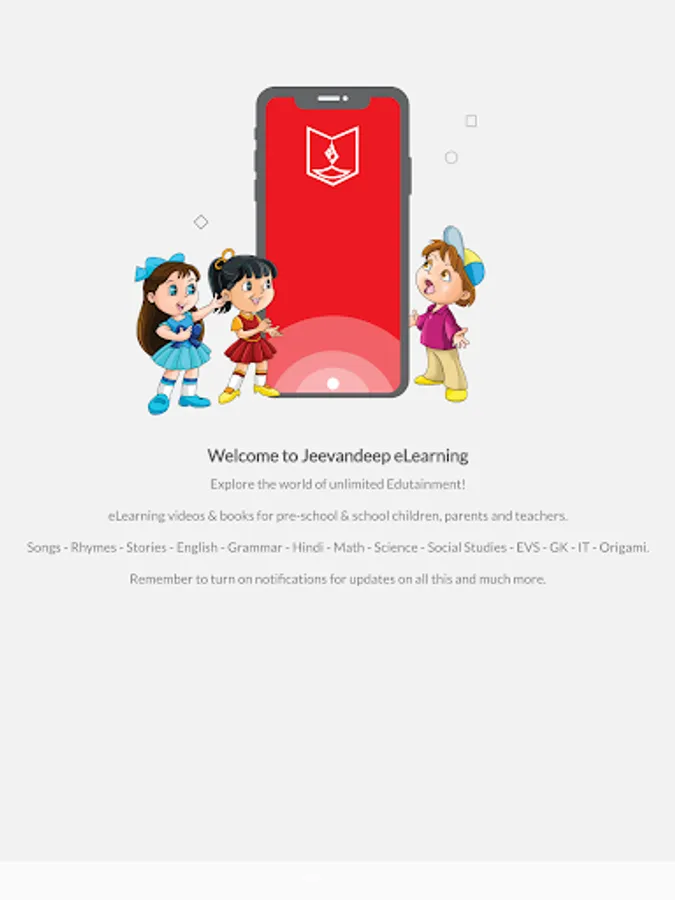 Our app consists of e-learning videos for Kindergarten to Class 10 on Songs, Rhymes, Stories, English, Grammar, Mathematics, Science, Social Studies, Hindi, Environmental Science, General Knowledge, Information Technology, Origami and much more.