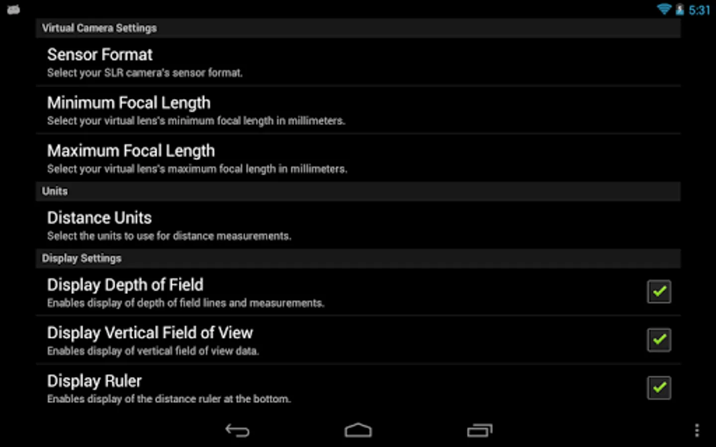 Additionally, there are controls for distance units (metric or imperial) and display of Full Frame Equivalent focal length (for cameras with sensors smaller than full frame.)