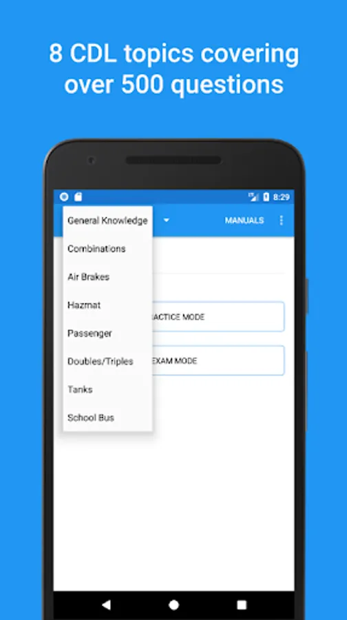 CDL Prep is the best way to prepare for the Commercial Drivers License General Knowledge, and various endorsement exams. CDL Prep contains questions on the following topics: General Commercial, Air Brakes, Combinations, Hazmat, Passenger, Tanks, School Bus, and Doubles/Triples.