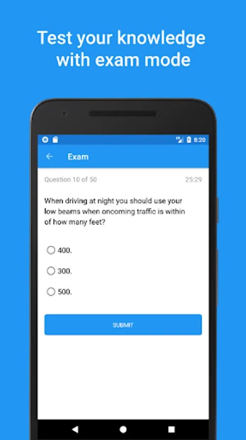 2. Exam Mode - 60 minutes to answer 50 randomly chosen questions, or 40 minutes to answer 20 to 30 questions on endorsement topics. At the end, review your score and any incorrect answers.
