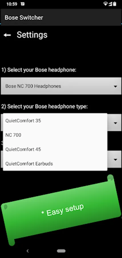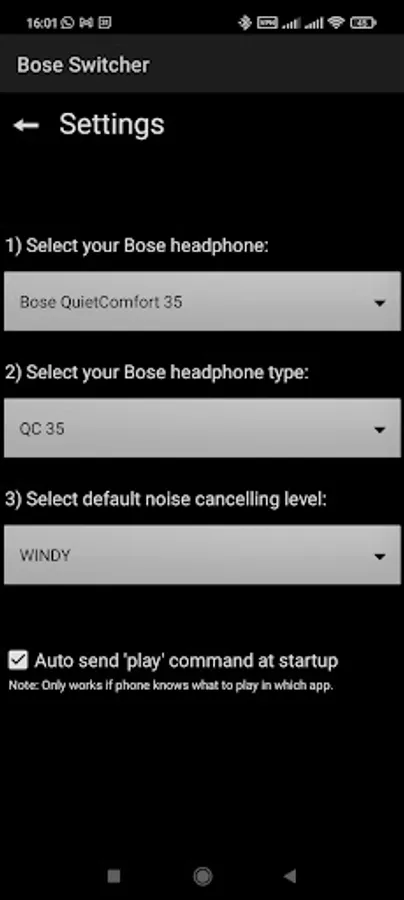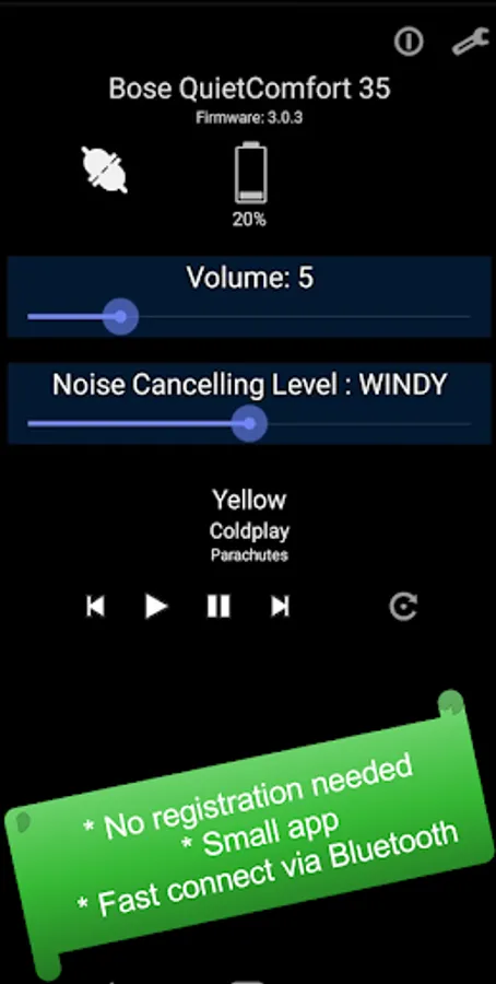 This app sets the Noise Cancelling level and equalizer settings quickly of your Bose Quietcomfort (35/ 45/ Earbuds) and NC 700 headphones.