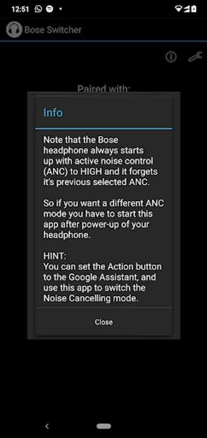Note3: This app sets the noise cancelling level temporary on QC. Noise canceling will be enabled next time when turn on your headphone or when you press action / noise control button on your headphones. You can set the Action button to the Google Assistant, and use this app to switch the Noise Canceling level.
