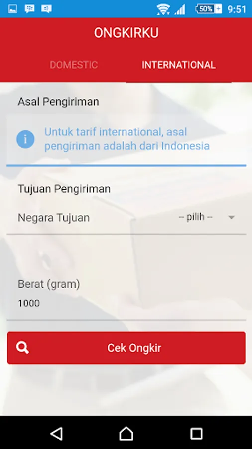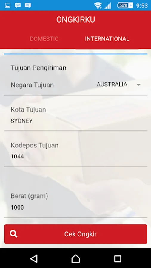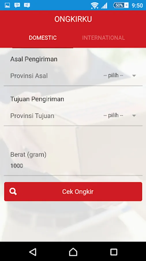 Gunakan aplikasi Ongkirku untuk melakukan pengecekan ongkos kirim berdasarkan kota asal dan tujuan, berat produk, dengan jasa pengiriman JNE, Pos Indonesia, dan Wahana untuk domestik, serta DHL untuk internasional.