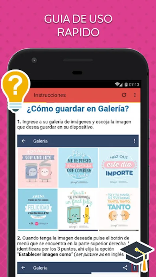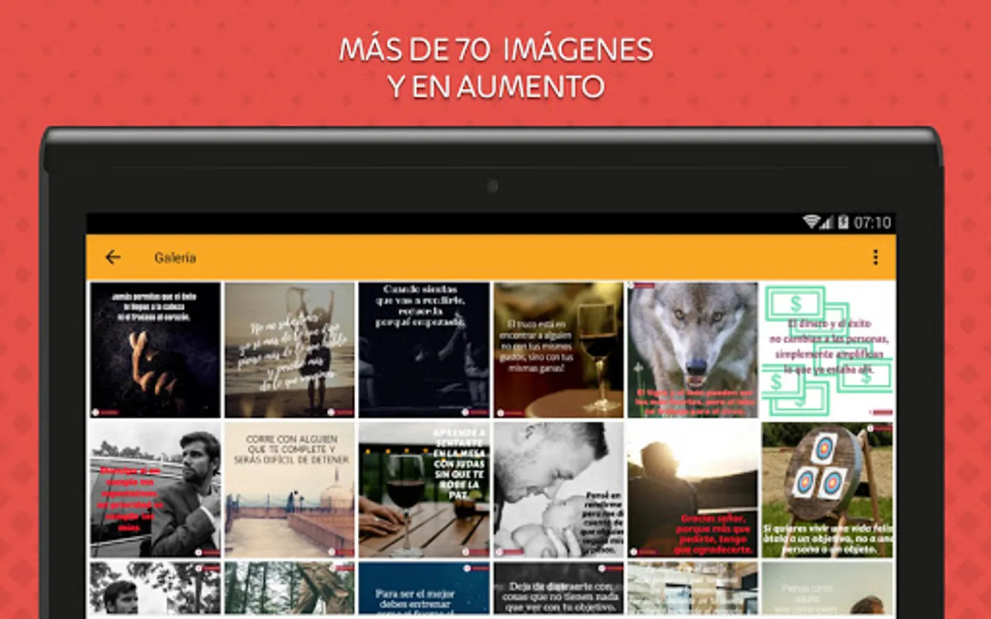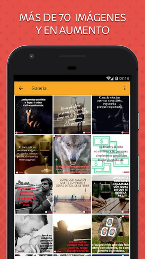 Our app offers you a gallery with more than 50 images, which have been conceived and designed thinking of you, to lift your spirits and leave a valuable lesson that allows you to be better every day. In addition, our app is lightweight and completely free, so you can download it as often as you want.