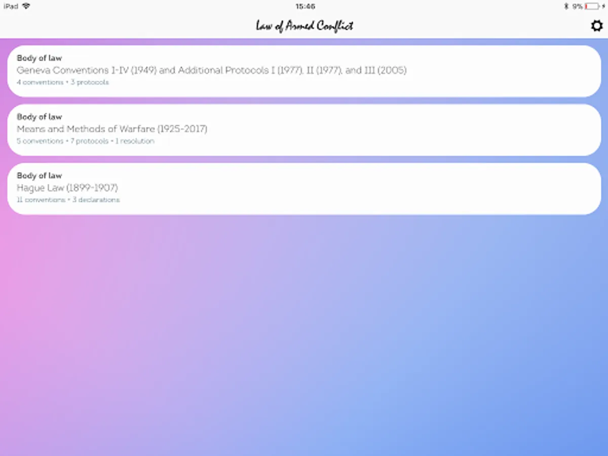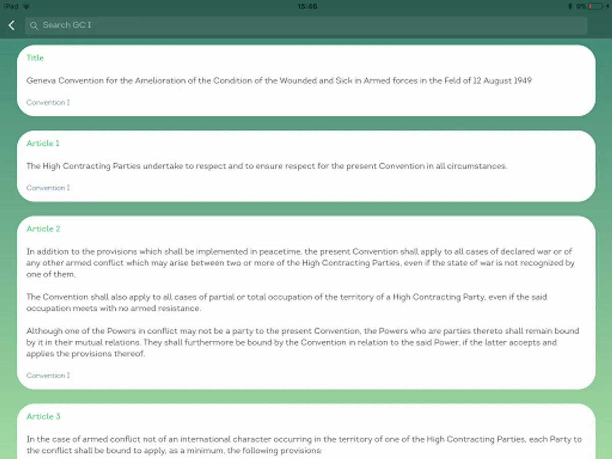 This app features the four Geneva Conventions (1949) and their Additional Protocols (1977) + additional IHL instruments. These texts are instrumental to any legal advisor, military commander, or international law scholar.