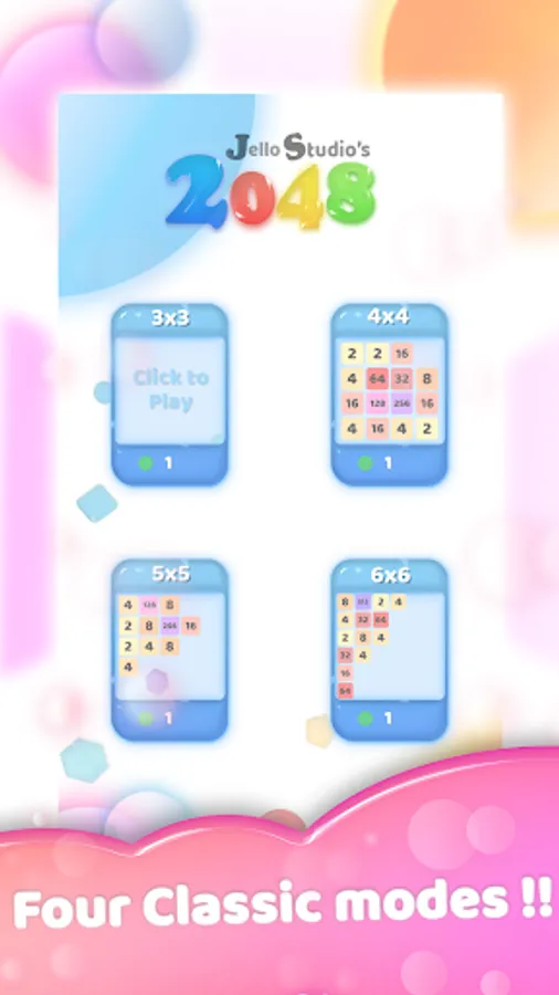 ● 4 CLASSIC MODES. Jelly 2048 features 3x3 to 6x6 grid sizes.