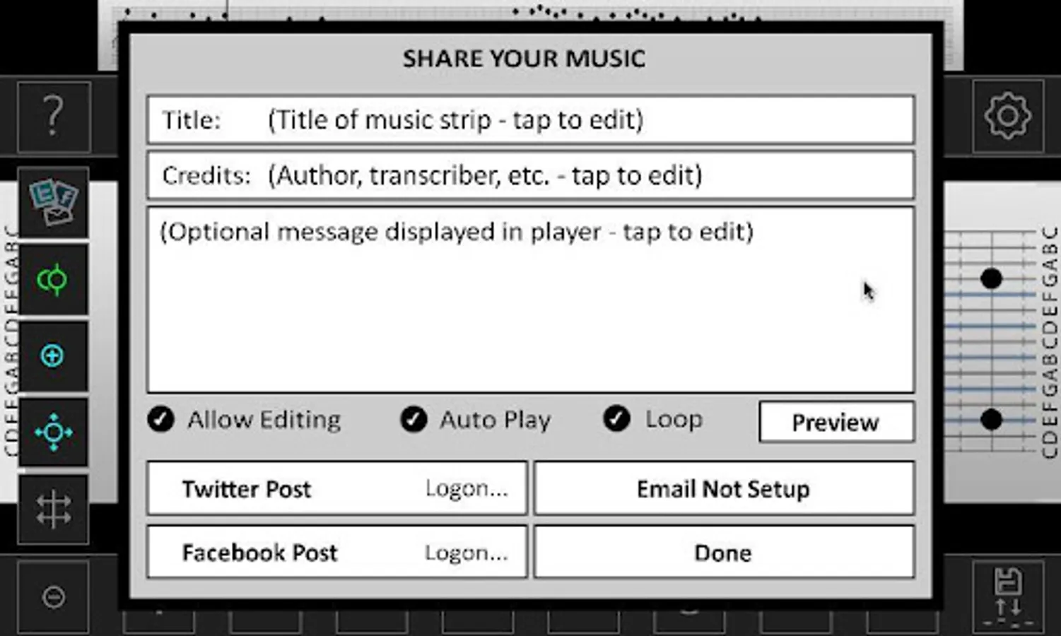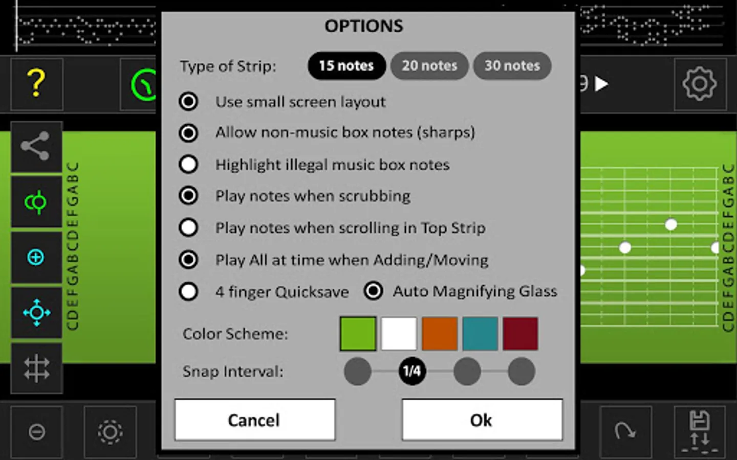 Designed to aid composing and editing your own music prior to punching the paper strips for Music Boxes, MBC allows you to compose, edit, preview, play, save and share your creations via Twitter, Facebook, Email or local file transfer.