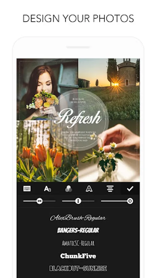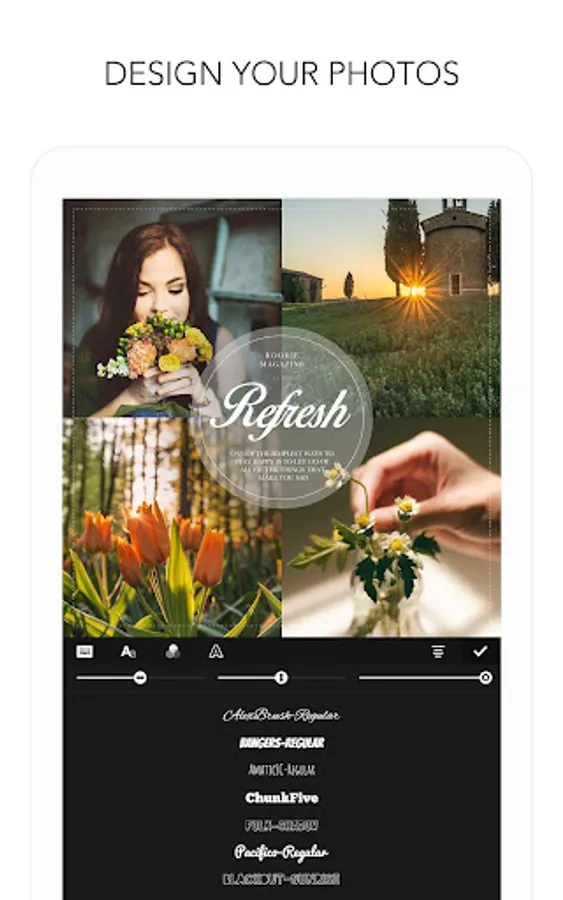 Find your special design tools in Rookie Cam - text function with 100+ fonts, 300+ badges and stickers to express variety of moods, 200+ unique shaped frames to perfect your photos.