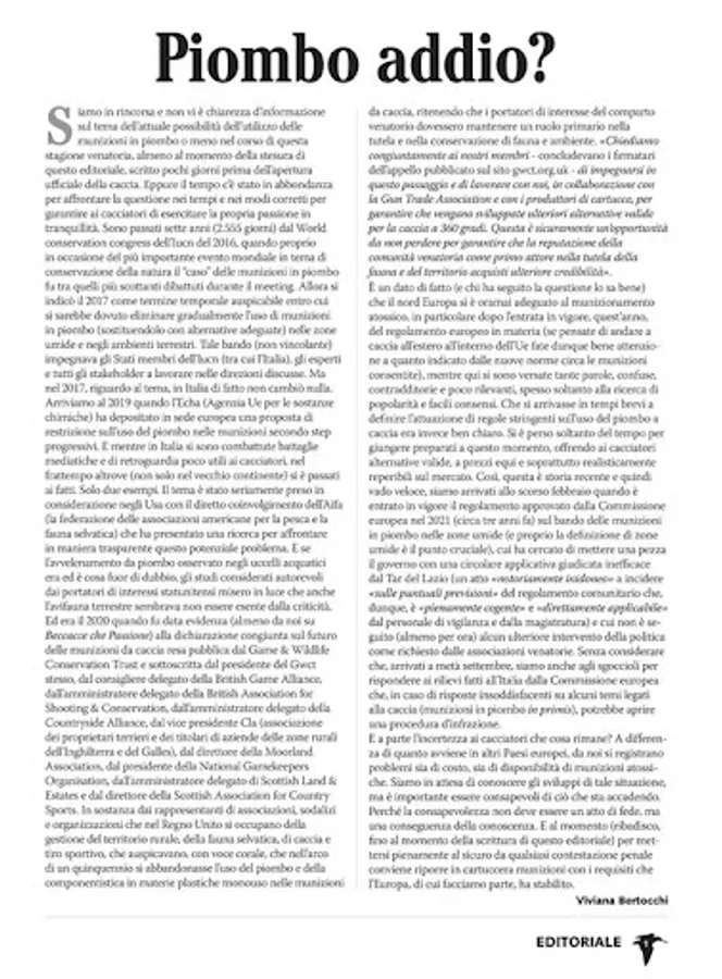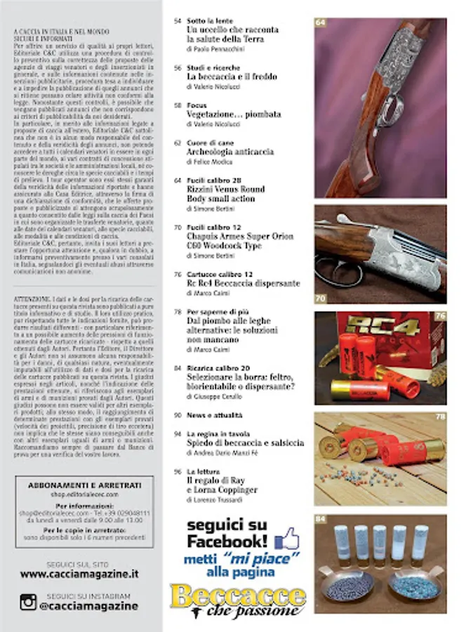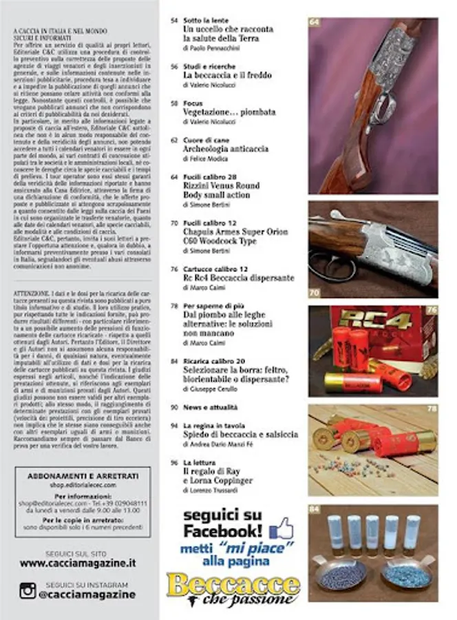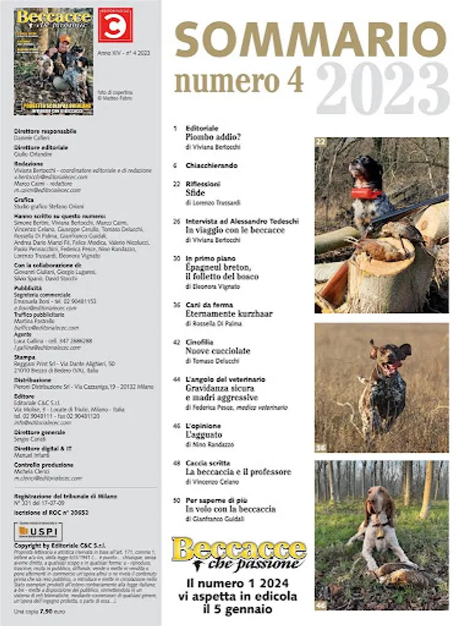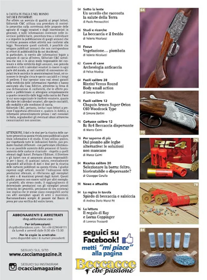 Rivista con oltre 10 anni di storia, dedicata esclusivamente alla caccia alla beccaccia e ai cani utilizzati per questa caccia. Oltre ad approfondire gli aspetti tecnici di questa affascinante caccia, affronta le tematiche scientifiche, biologiche e sociali legate a questo migratore e alla specifica attività venatoria. Si parla delle varie tecniche di caccia, delle tradizioni che fanno parte della storia della caccia alla beccaccia, delle problematiche gestionali che interessano questo migratore, delle varie razze canine selezionate per questo tipo di caccia. Nelle sue pagine trovano inoltre spazio racconti, prove tecniche, cinofilia, ricette e quanto di estetico gira intorno a questa nobile caccia. Non mancano articoli di caccia alla beccaccia all’estero, sempre nel rispetto delle piu’ rigorose tradizioni venatorie.