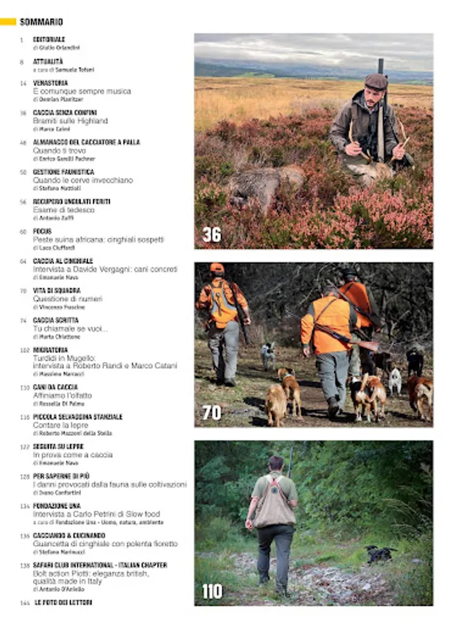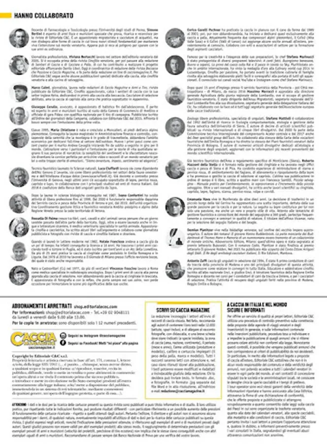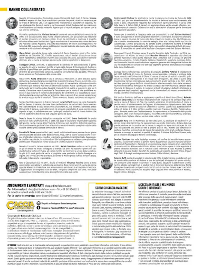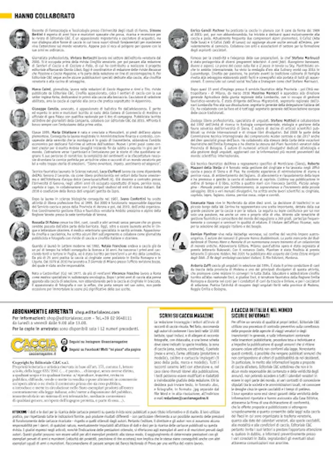 Un mensile dedicato a tutti i cacciatori. Nasce dall’esperienza di Sentieri di Caccia, Cacciare a Palla e Cinghiale che passione, riviste che hanno fatto informazione e diffuso cultura nel mondo venatotio. La rivista affronta ogni mese un grande ventaglio di argomenti: la caccia alla selvaggina stanziale, quella di selezione e la caccia alla migratoria e al cinghiale nelle sue varie forme. Troverete inoltre sezioni dedicate alla gestione faunistico-venatorie e alla caccia pratica; inoltre tantissime rubriche che affrontano problemi di diverso tipo sempre attuali. Su caccia Magazine si parla di caccia e la si vive, in tutte le sue forme. Perché la caccia in Italia la raccontiamo noi.