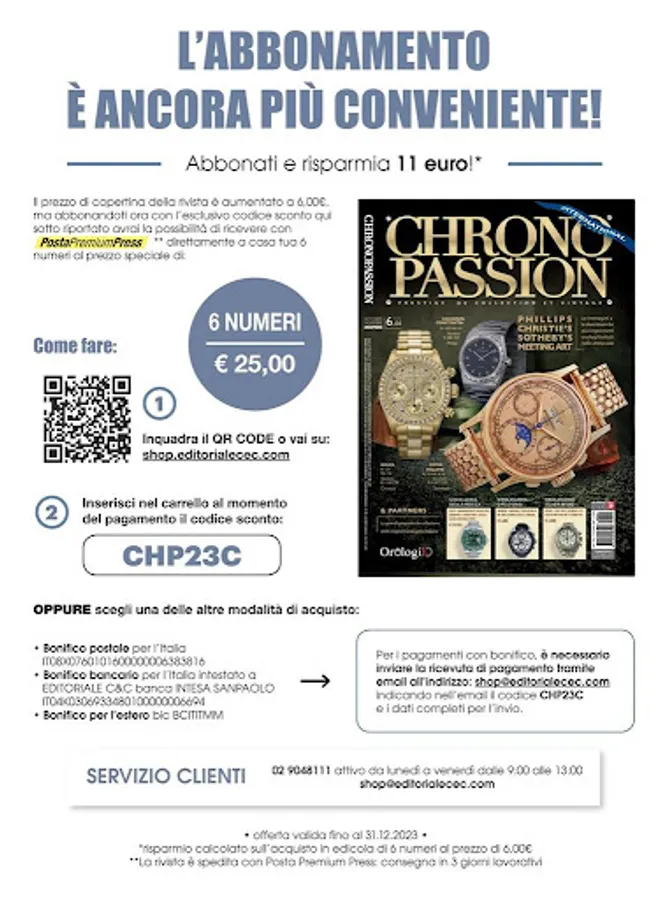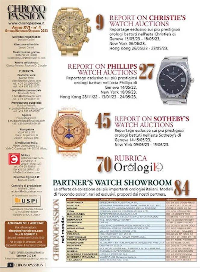 Data la pubblicazione seguente alle aste nelle sue pagine sono riportate anche le cifre di aggiudicazione, informazione di difficile ottenimento al di fuori della presenza in asta. La lingua è inglese per mantenere la precisione della ricerca iconografica e storica fatta per ogni lotto dal Dipartimento Orologi della Casa d’Aste. Chrono Passion si propone come l’unica rivista di settore in Italia dedicata esclusivamente al mondo degli orologi da collezione presenti sia nelle aste e sul mercato di “secondo polso”. Un universo di clientela molto affluente e di operatori di altissimo livello. Seguono alcune pagine dedicate alle offerte di un selezionato gruppo di orologiai italiani.