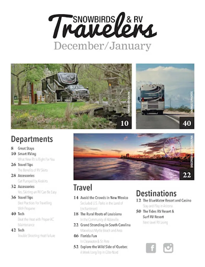 Read articles on the best RV parks and resorts as well as key RV friendly attractions, events and sightseeing routes. Lifestyle articles as well as tech, gear and gadget reviews and special supplements make it a must read magazine to get the most from your RV experience.