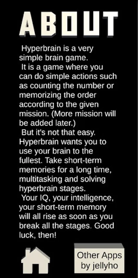 Hyperbrain is a very simple brain game. Remember the color, or count the shapes. Or remember what sounds you heard, right or left (earphones required). You only have to remember one thing at first, but you have to think about several things at the same time later. So your multitasking skills and short-term memory are very important games. Make the most of your brain. When you're done with this game, your IQ, short-term memory, and multi-tasking skills will all rise. Good luck, then!
