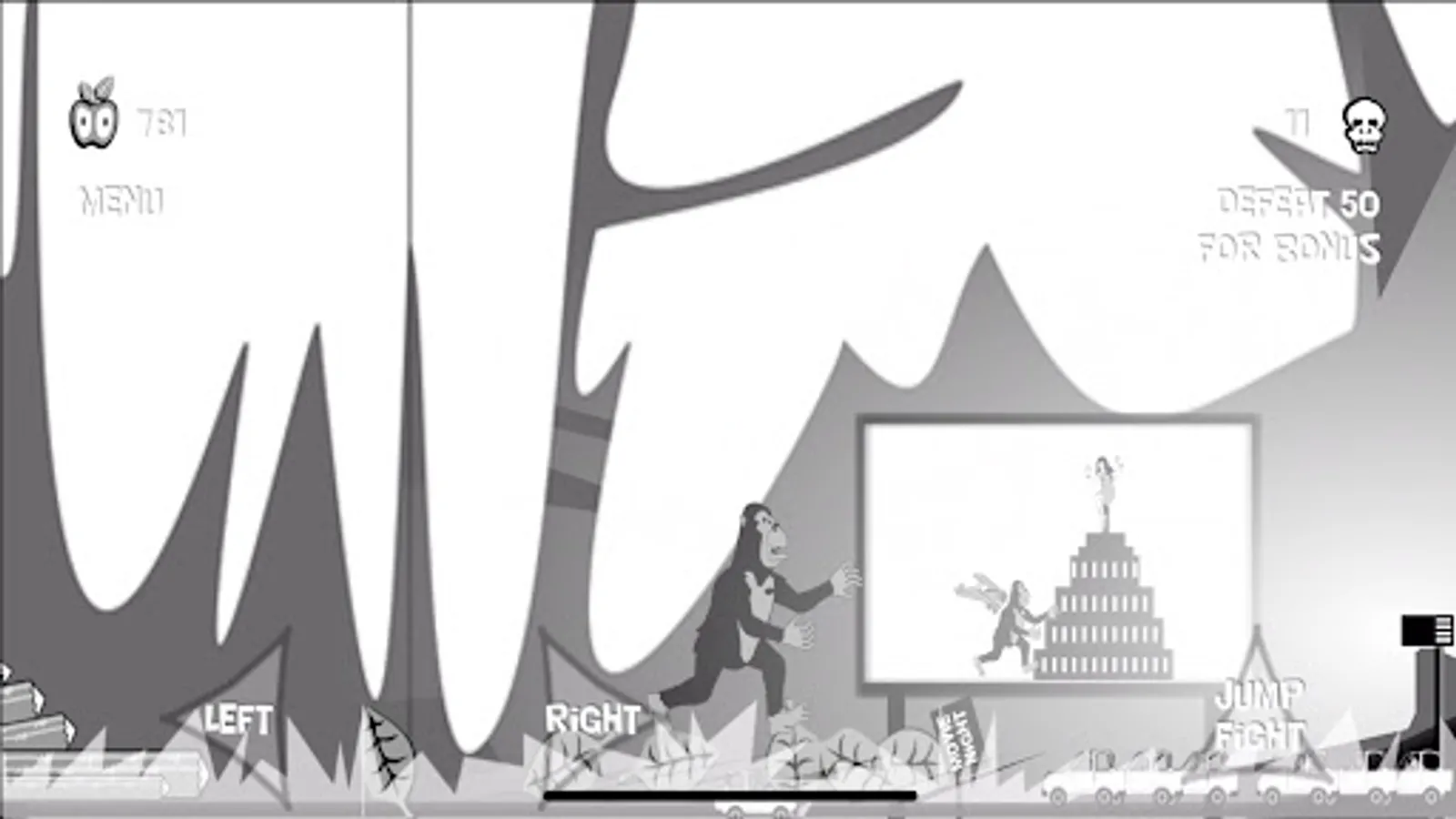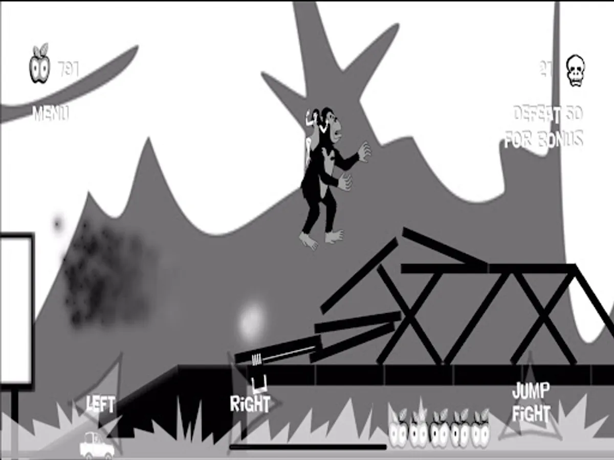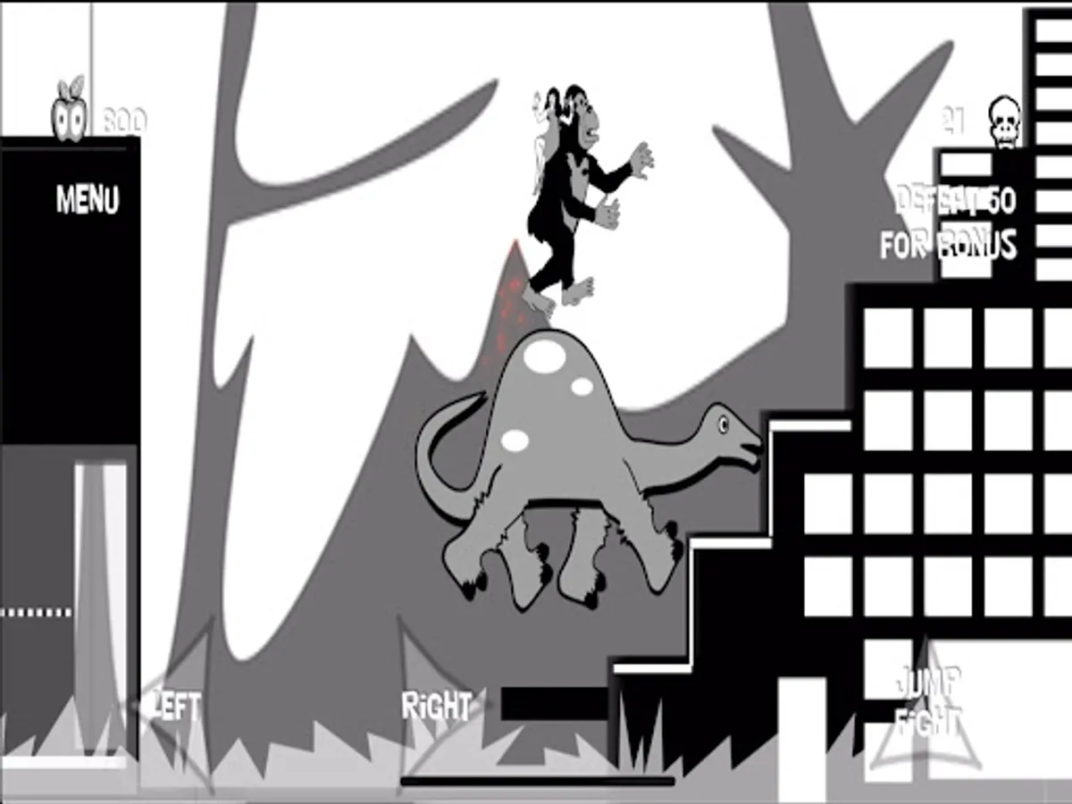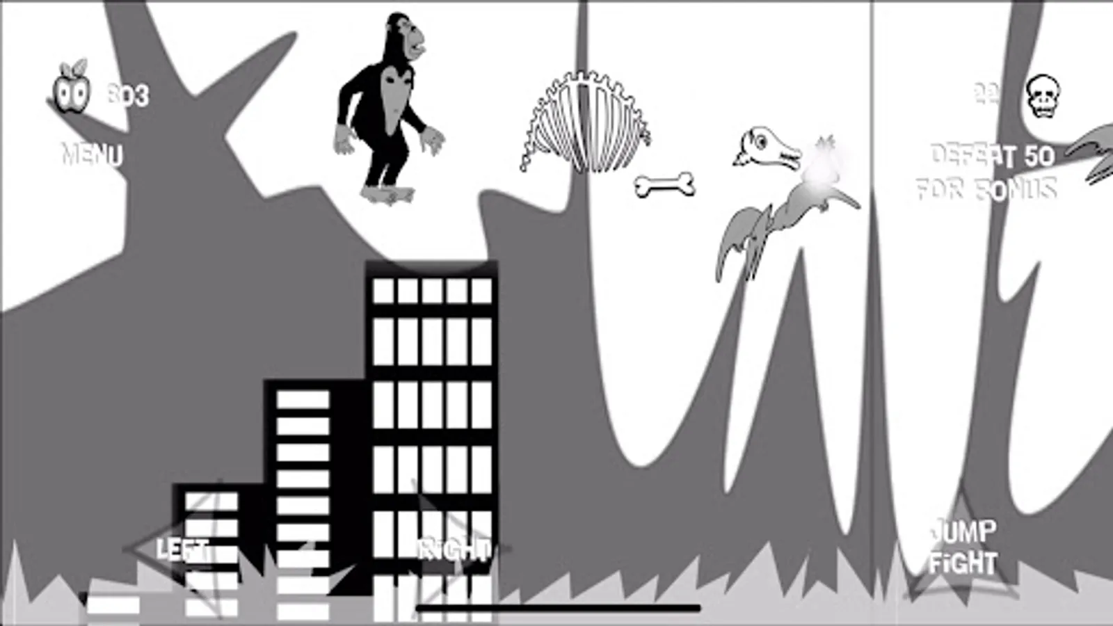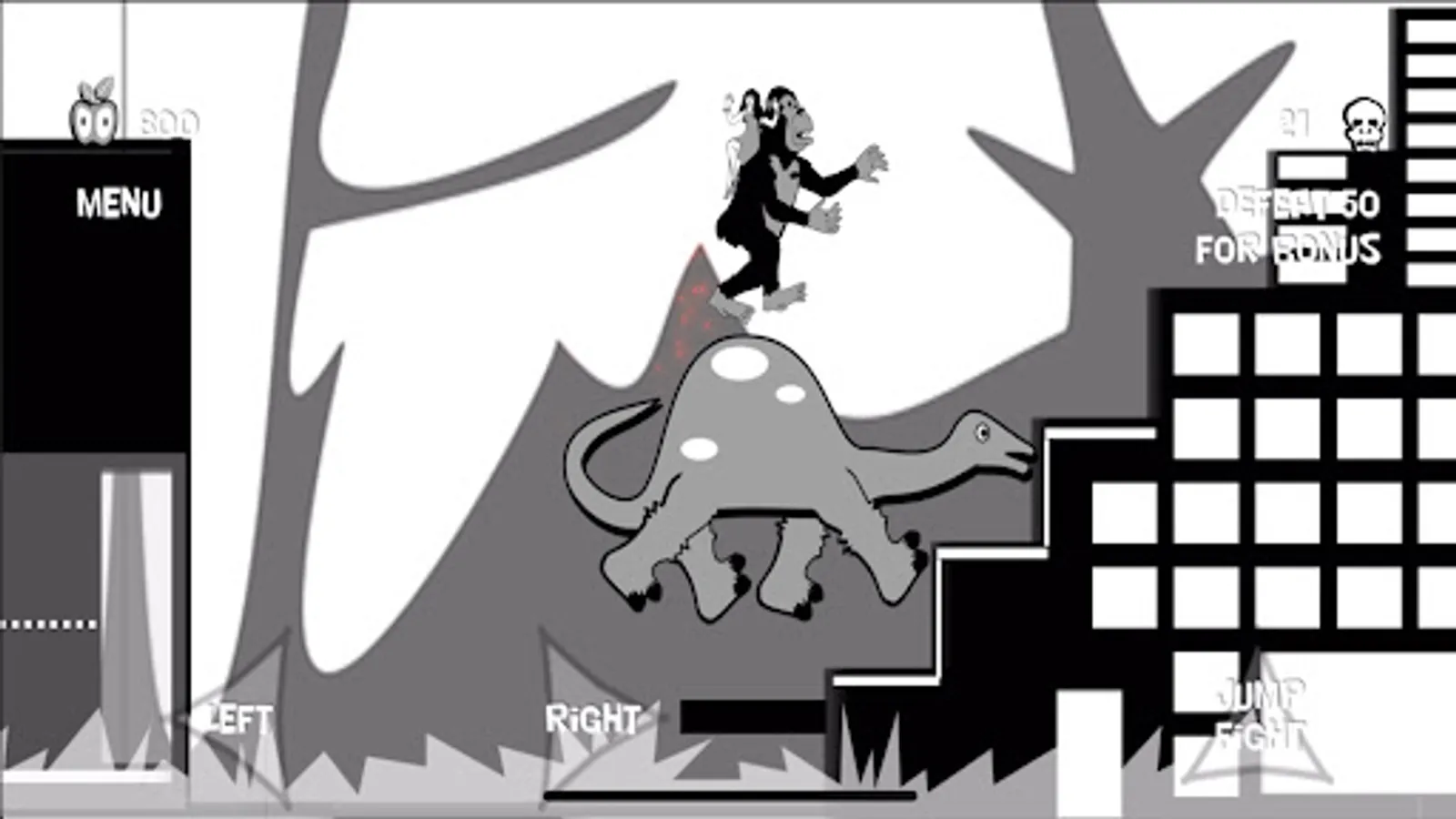 Find and rescue your favorite girl. Collect fruit and trade it for upgrades so you can play as other apes. Collect enough fruit to unlock a Sasquatch, or Yeti. Defeat 50 enemies and receive a 250 fruit bonus! Ride the Dinos and they will destroy enemies on contact. Even a Dino skeleton will destroy enemies, it's amazing! The Dinos will protect you with their life, but they can also run you over when they get scared and stampede, so look out! For me, riding Dinos is one of the most hilarious and chaotic parts of this game.