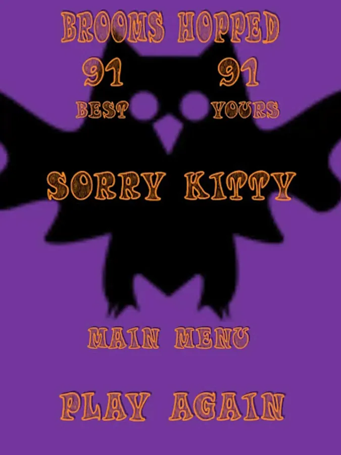 So here it is. Broom Hopping is a classic Halloween video game perfect for all ages. Game play is simple. You just tap left or right and do your best to help the kitty hop from broom stick to broom stick. You can even hop on the bats to keep you going. If you need a little extra juice, the Jack-O-Lanterns give you a power up so you can survive the owls and spiders. Play against your friends to see who can hop the most broom sticks. If you love cats or Halloween, (or cats and Halloween), this game is for you.