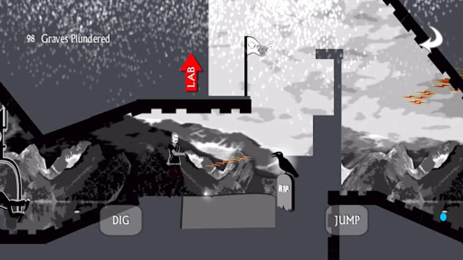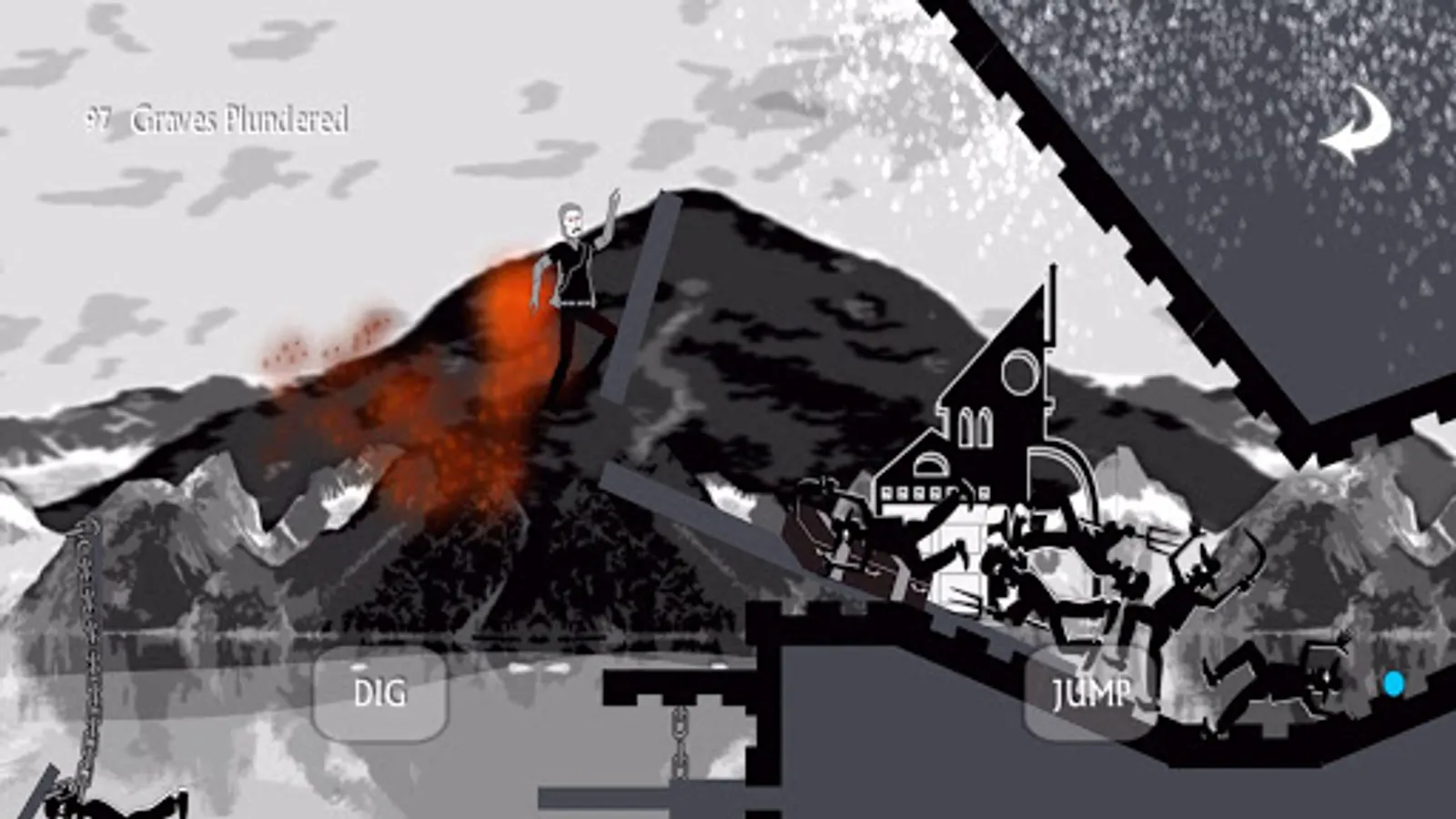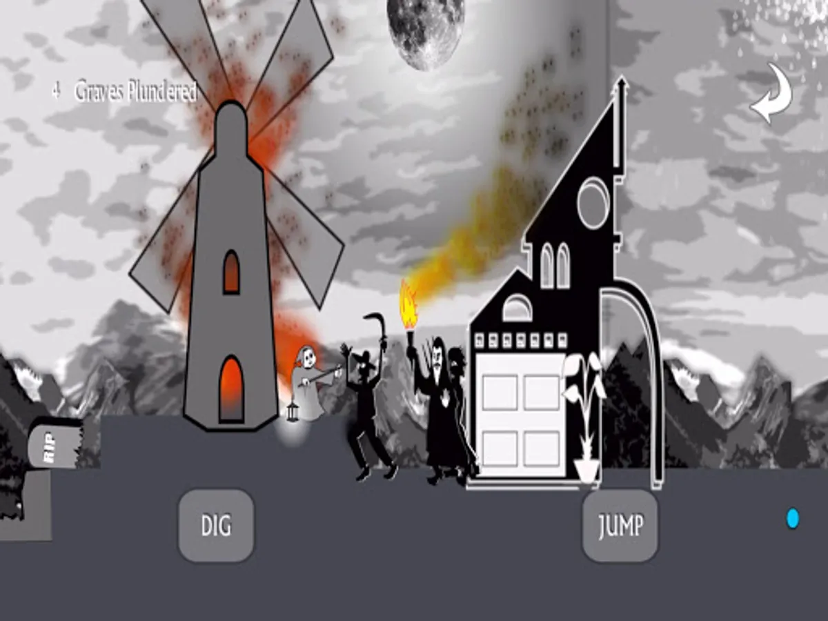 Controls are swipe left or right, dig, and jump. Use your dig button as a weapon to shoo the crows out of your way, fight the angry mob of villagers, and battle other strange beasts that go bump in the night. Click the white arrow in the top right corner if you fall spiraling endlessly into the abyss. It can happen.
