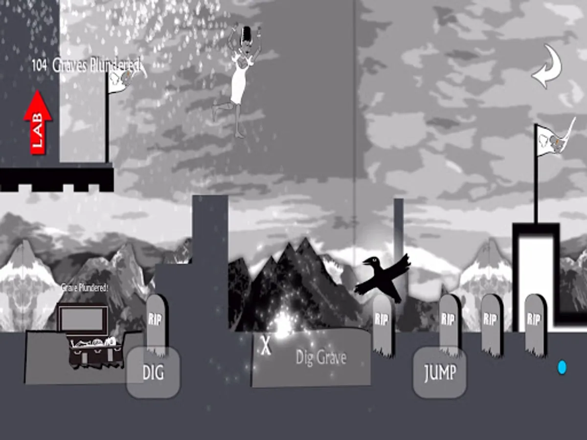 Be careful of the hallowed ground at grave sites. If you step on it, you might die. Be sure to dig at the X until each grave is plundered. Use your shovel to shoo the murder of crows away. Don't try to push past them. Crows are fierce. Move on from platform to platform avoiding obstacles and do your best to plunder 10 graves before you return to the lab. For every 10 graves you plunder, you get a new body part. Build and then play as Frank, the Bride, and even a cute puppy named Spot. By the end you have one big creepy family.