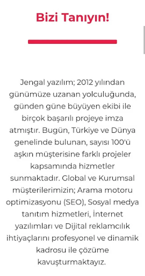 Jengal software; In its journey from 2012 to the present, it has accomplished many successful projects with its team that grows day by day. Today, it provides services within the scope of different projects to more than 100 customers in Turkey and around the world. Our Global and Corporate customers; We solve the needs of search engine optimization (SEO), Social media promotion services, Internet software and Digital advertising with our professional and dynamic staff.
