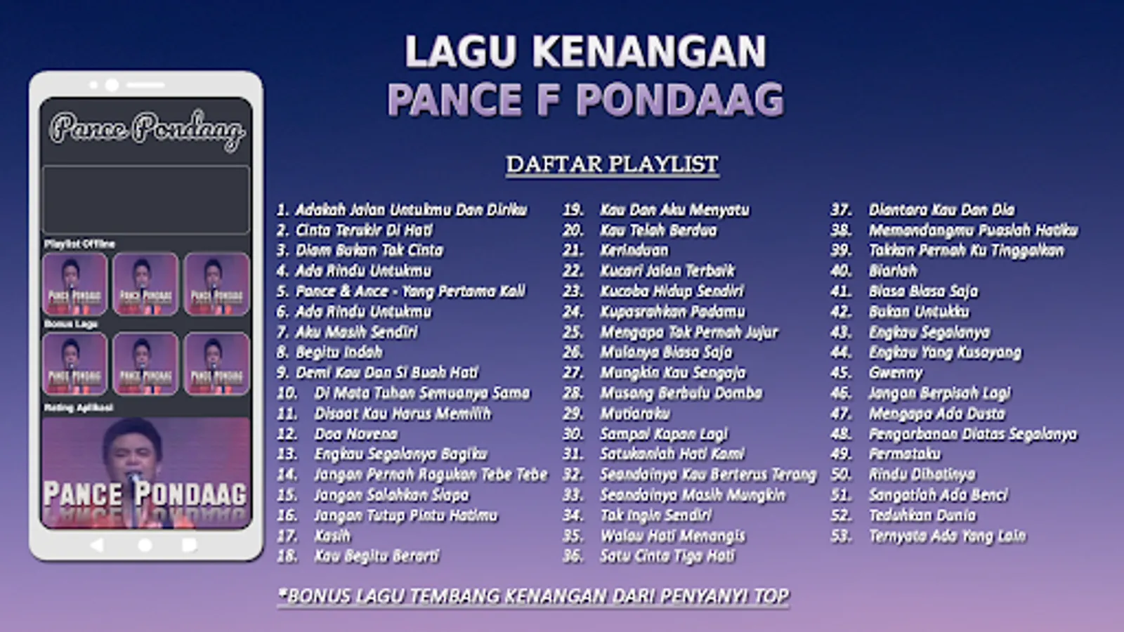 This application contains Pance Pondaag memory songs which are specially made for you fans of Pance Pondaag and fans of memorable songs.