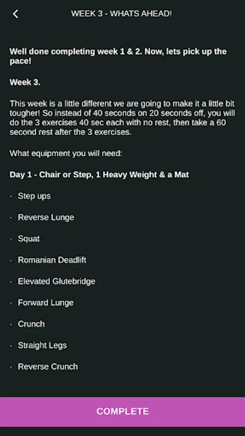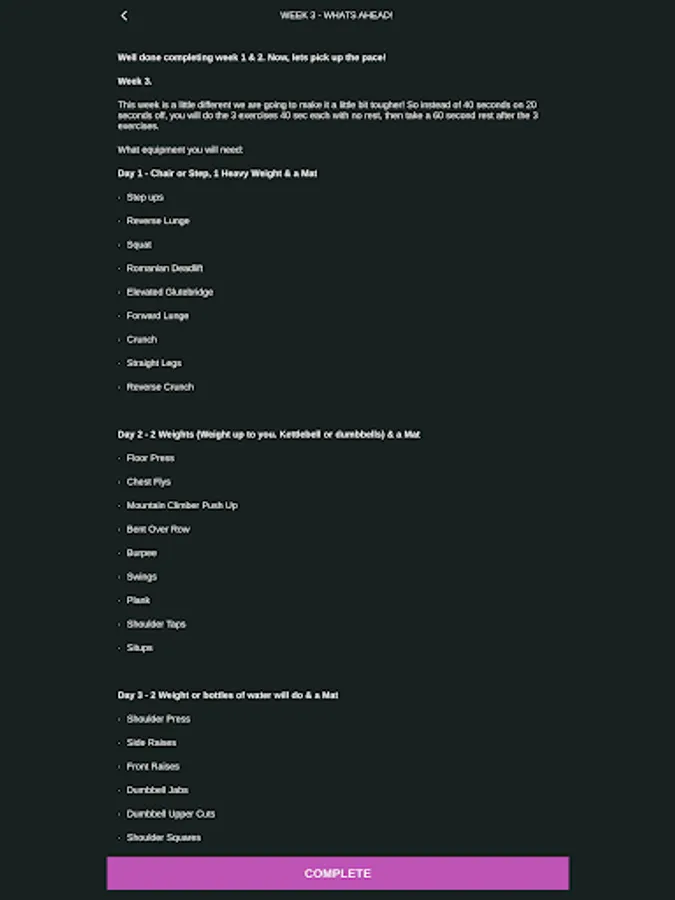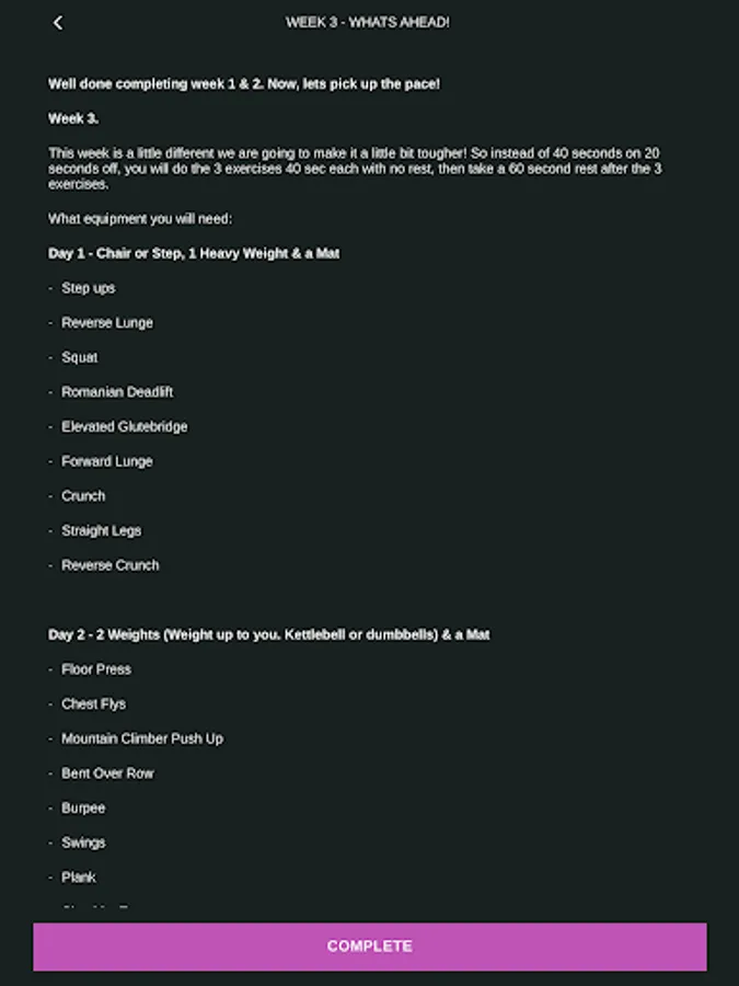 This program is not for the faint hearted!! ITS HARD but so enjoyable if you follow through to the end. The results from this program are unreal. Each week features a different style of workout i.e. HIIT, STRENGTH TRAINING, BODY WEIGHT EXERCISES, MINI BAND WORKOUTS & CORE WORKOUTS.