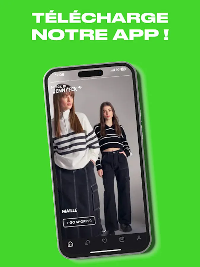 Download the Don't Call Me Jennyfer App now and discover a cool new way to shop. Shop the most stylish clothes, be on the lookout for fashion trends and new arrivals arrive every week! Build your look according to your personality and make your personalized wishlist with your favorite pieces. Each time you make a purchase, you accumulate € in your kitty: ideal to offer you THE new cargo jeans. On the DCM Jennyfer application, find the entire catalog of our products and access the online store to shop the best women's clothing: Skirt, Cargo jeans, Parachute pants, Oversize sweatshirt. Also find all our collaborations on the application: Disney T-shirts, our Manga collabs, Stitch pajamas, etc.