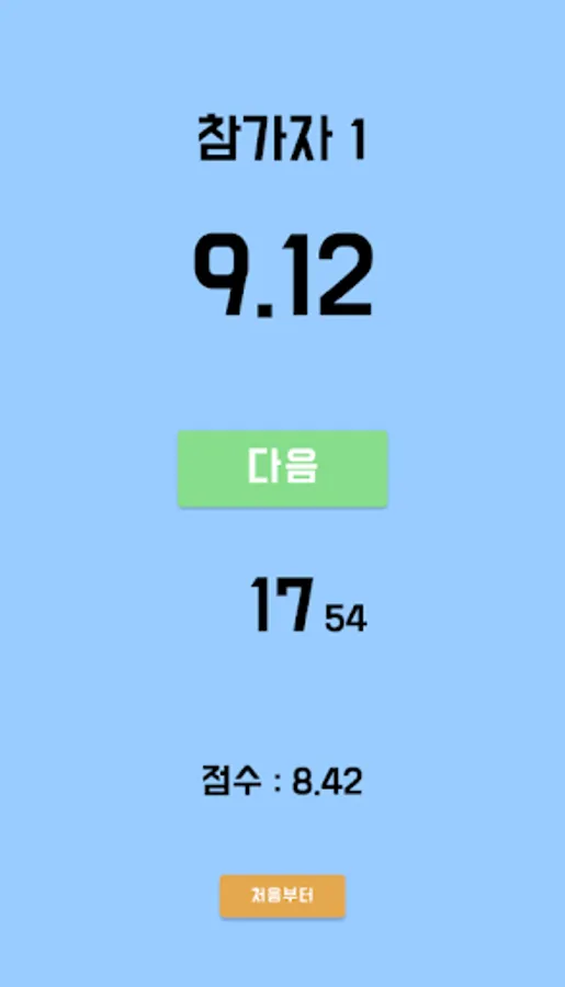Press the start button → (after time passes) → press the stop button → display the elapsed time and score → press the next button to play the next player