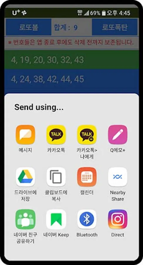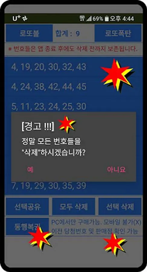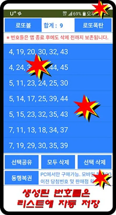 로또폭탄에서 "노란색 폭탄" 그리고 로또볼(ball)에서는 "노란색 공(ball)"을 먹게 되면 로또번호들이 생성됩니다. 생성된 로또번호들은 리스트(List)에 자동으로 저장되며, 앱을 종료하더라도 사용자가 직접 삭제하기 전까지 계속 보존 됩니다.