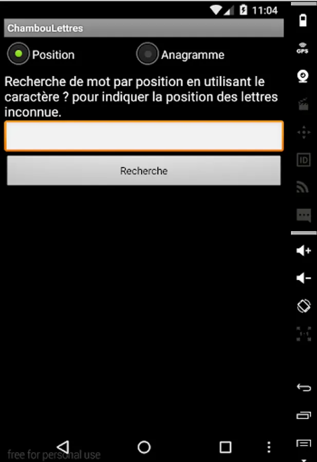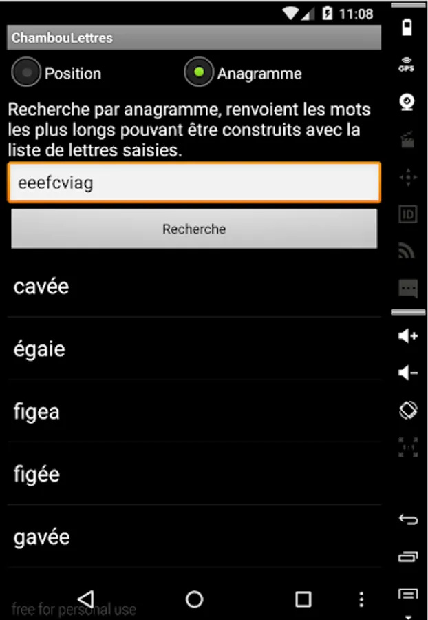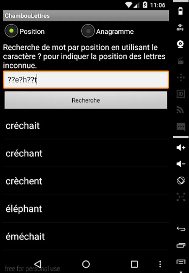 Application for searching for words to word games in French. Two types of search, a search by first position such search words that have the letter E in third position and the letter 'a' fifth '?? e? A'. Second form of research by anagram reference the longest words consisting in part or part of a list of letters.