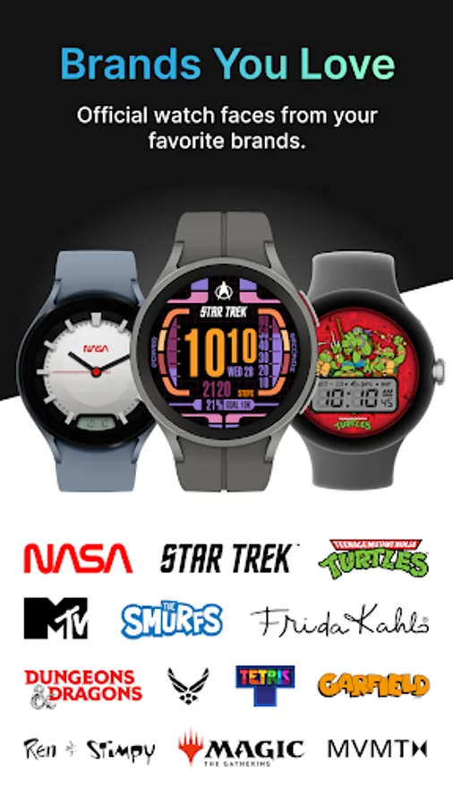 Find hundreds of premium faces from the world’s leading brands like Tetris™, Star Trek, Garfield, Ghostbusters, American Dad and more. There are new brands being added all the time so keep an eye out for new watch faces.