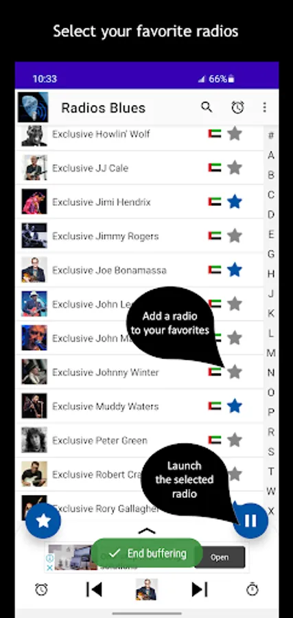- Radios: 131 Blues radio stations from all around the world. Radio streams are in high quality (128 kbits/s)